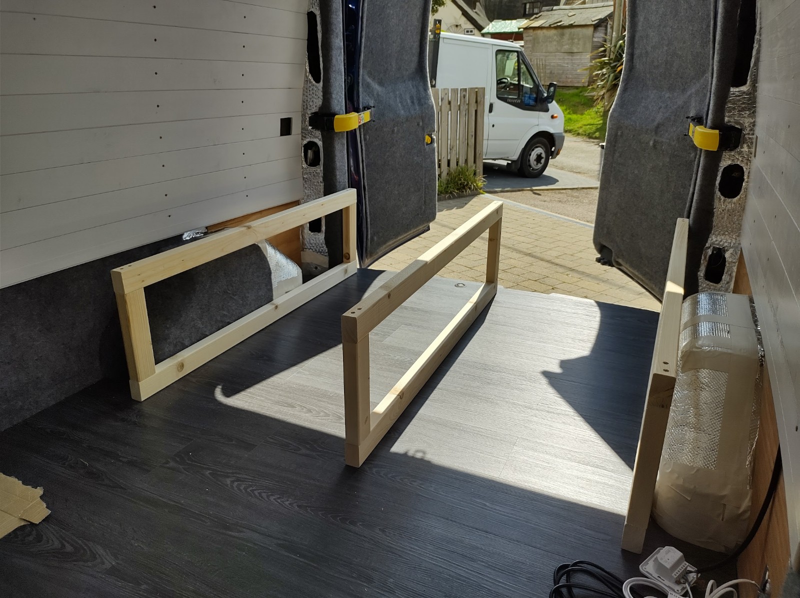 We didn’t secure the timber frames to the floor of the van, but our van already had fixing holes into the top of the wheel arches from the ply lining that was there when we bought it.
