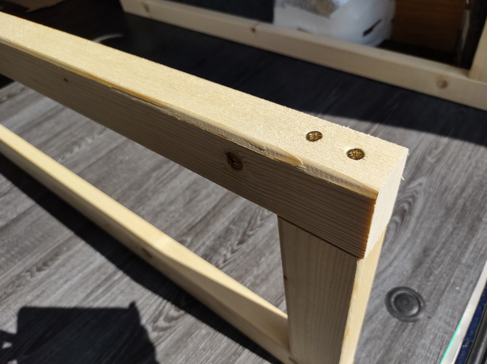 So, with the design agreed, we focussed first on building the fixed portion of the bed frame. Efficient use of the space under the bed for storage was going to be really important for longer trips, so we thought about how we would actually use this o a day to day basis. We fixed on using storage boxes, which we would be able to access either from the rear of the van or from the inside. This dictated the orientation of the frame supports, to allow us to slide things in and out. We wanted the frame to be sturdy, so used chunky timber that is designed for making stud walls, and designed the joints so the timber took the weight in compression without undue stress on the screws.