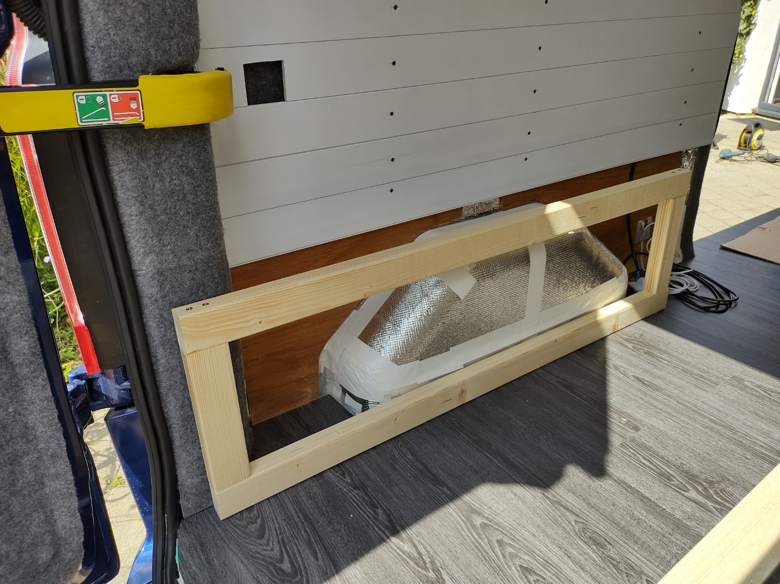 In the photo above you can see the controller for the underfloor heating loose on the floor on the right hand side. Before we got into building the removable leaf and supports, we mounted this controller on the side of the fixed bedframe. This provides a solid mounting position to minimise vibration. It is easily accessible when the van is in sofa mode, and still just about accessible when you reach round the side, when the van is in bed mode.