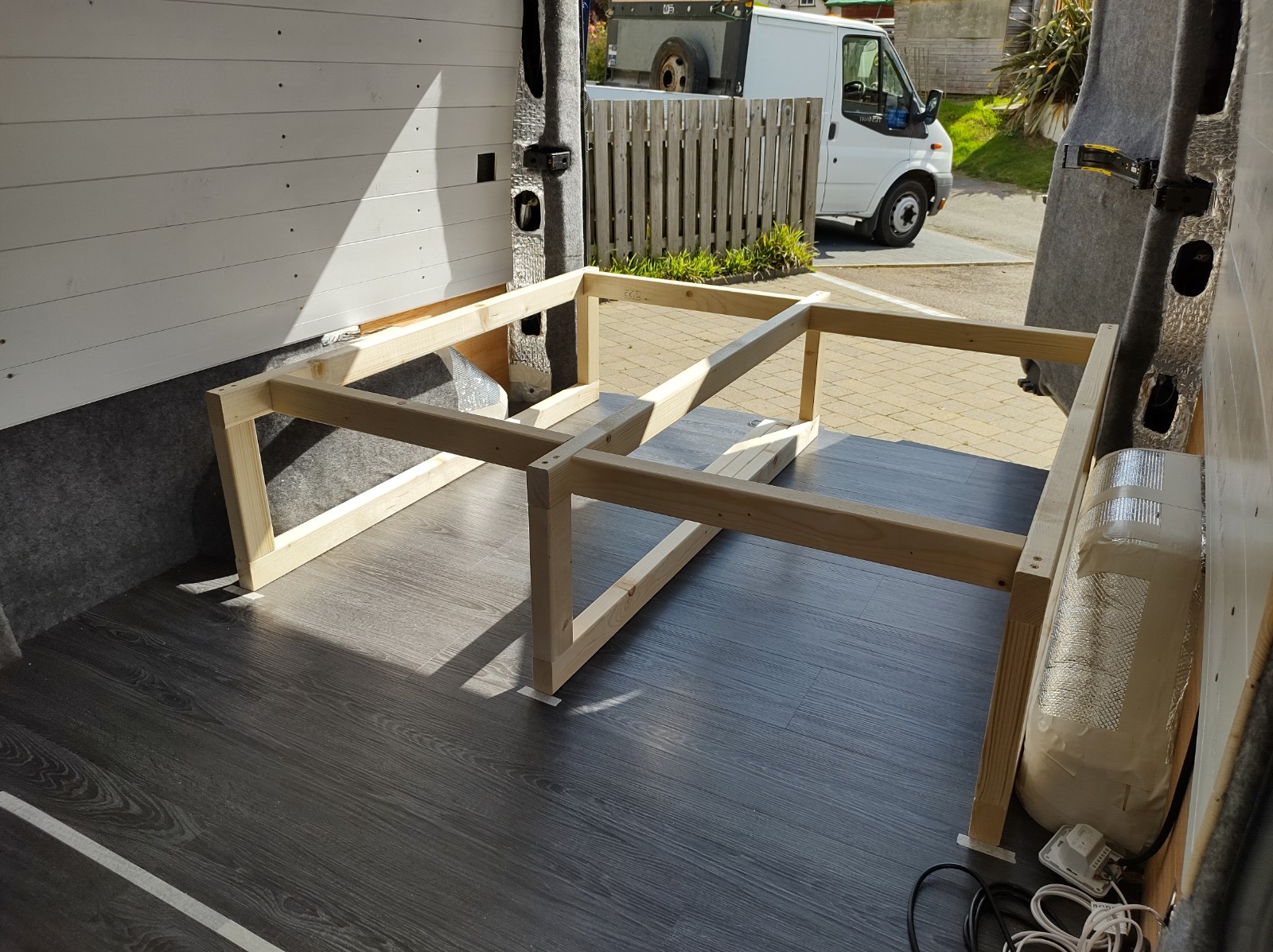 We made 3 frames for each side of the bed and one support for the centre and then joined them together. The two sides were positioned inside the wheel arches, which left a small volume behind the wheels each side of the bed. The idea is to turn these areas into storage spaces accessible from above. As I type this months later, we still haven’t got around to doing this, but it is still very definitely on the list.
