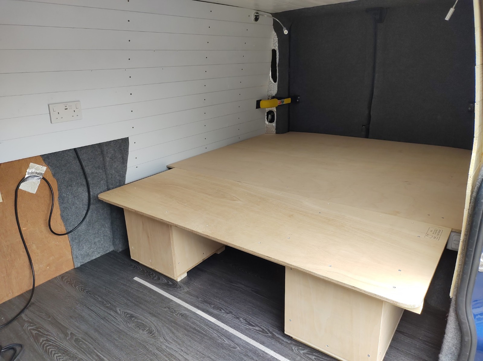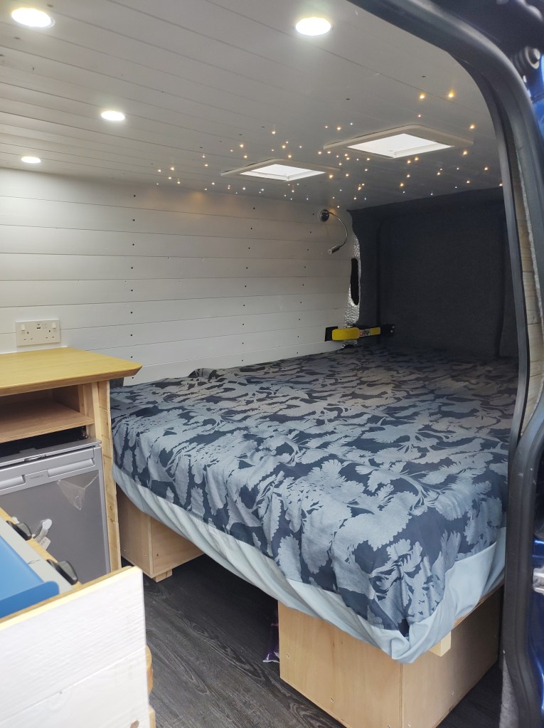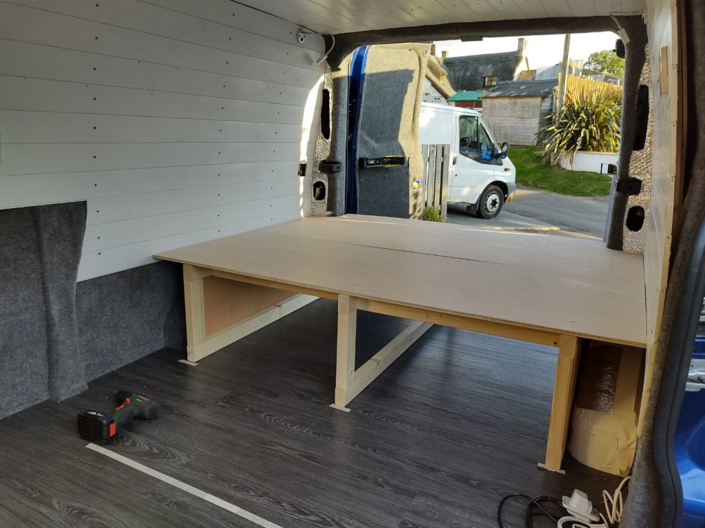 The inside of a Transit Custom is not quite wide enough for Mr W to lie flat width-wise, so that decided the orientation. We like to sit in bed with a cup of tea in the morning, so that dictated the maximum height the bed platform could be.