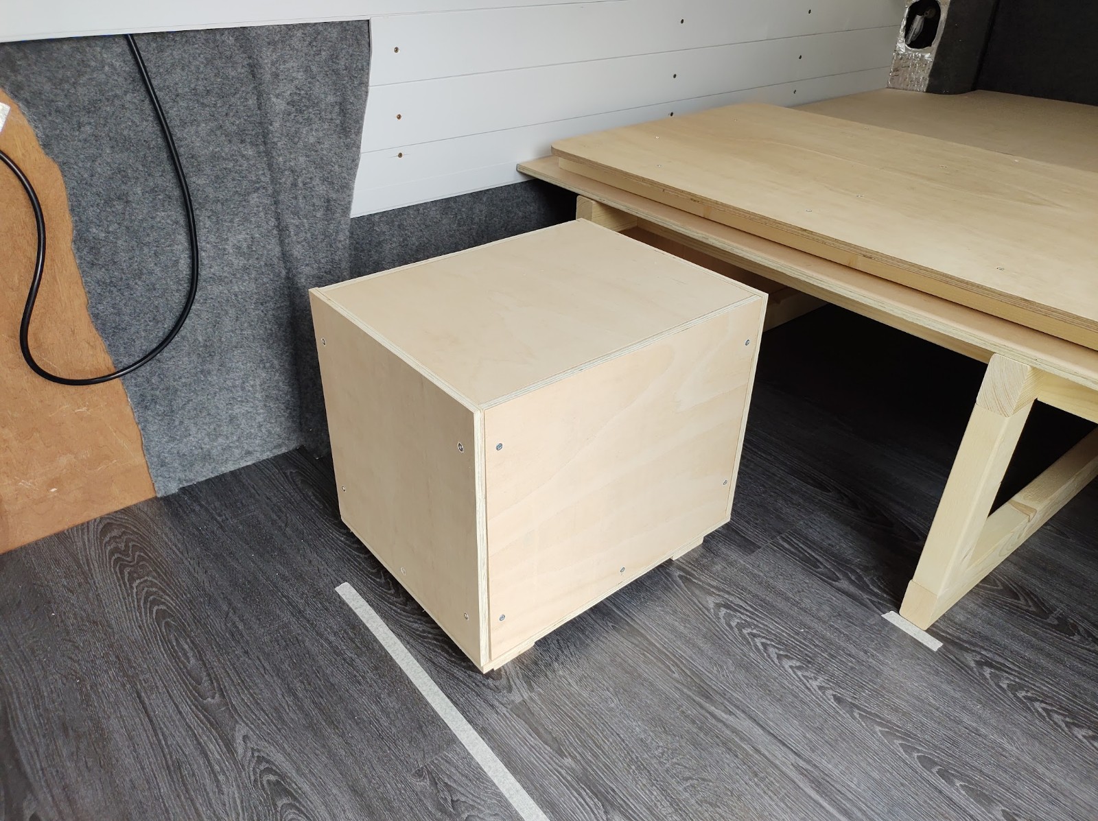 Getting the storage stools just the right height was important to have both sections of the bed level. You can just about see in the images below that the storage stools have runner feet on them. This is to help air to circulate, as the under floor heating mat instructions warned against permanent ‘hotspots’ where things are sitting on top of the heated floor. These feet have offcuts of the 3 way stretch carpet used on the doors and wheel arches attached, so they can slide around without scratching the vinyl floor.