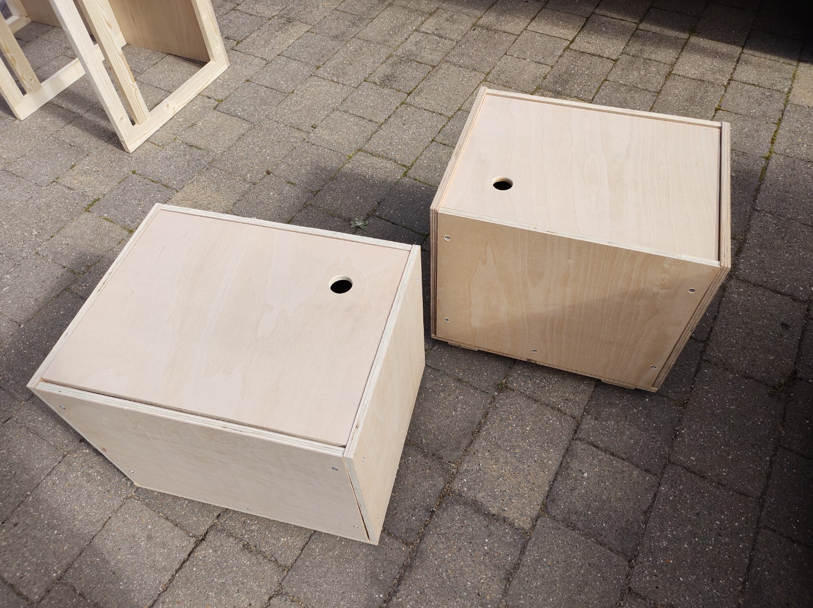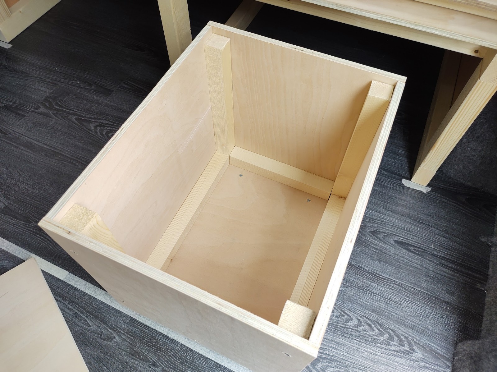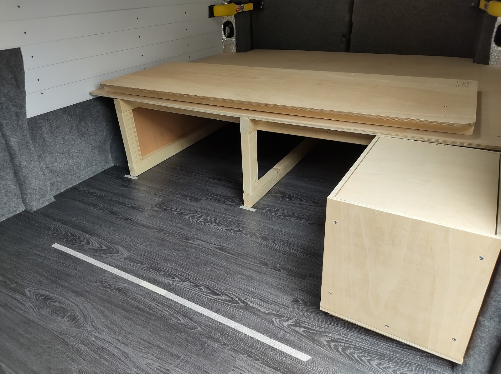 When in bed mode, this section is supported by 2 ply boxes, which serve as storage and also stools when the van is in sofa mode. The reinforcing timber was fixed to the ply top in a pattern that locates these 2 boxes. I don’t have a photo of the underside of the removable section, but imagine shallow pockets the thickness of the timber, which are sized just larger than the outline of the storage stools.