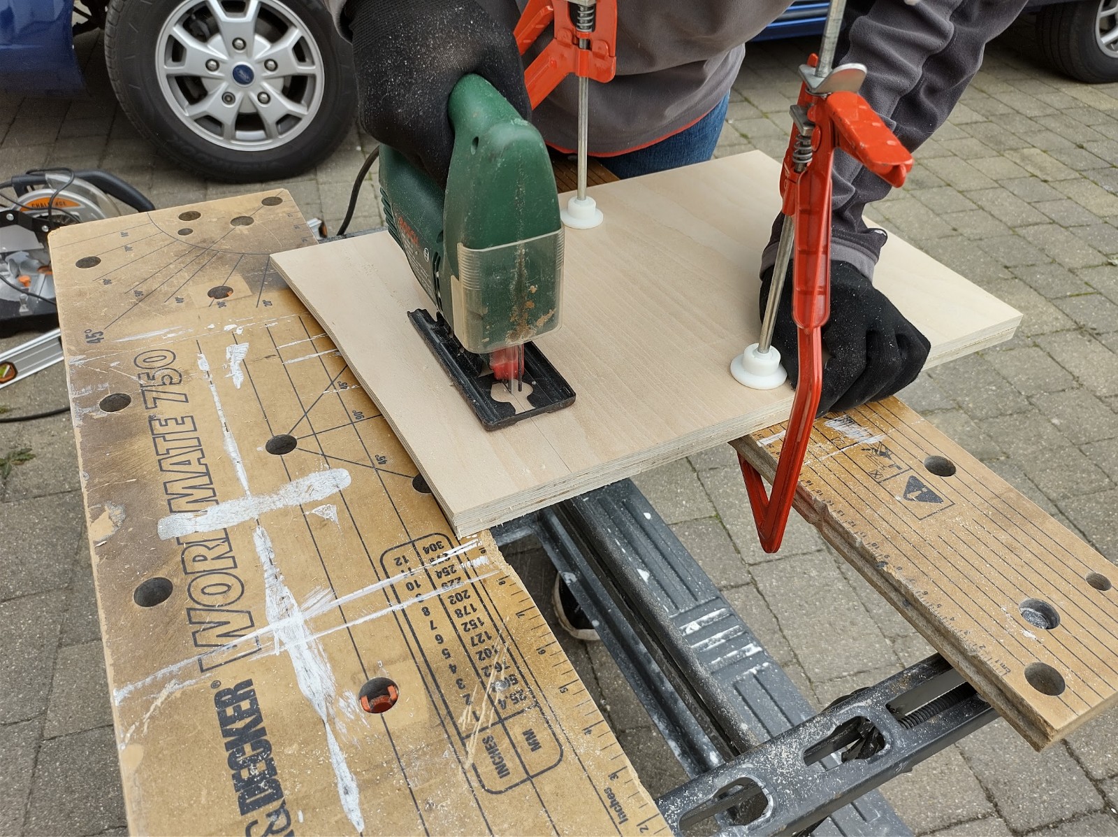 Once the basic support frame was in place, we cut plywood to cover the frame and overhang it on each side up to the cladding on the side walls. We bought big enough sheets of ply to do this in 2 pieces. Manoeuvring those pieces into the space was not an easy job, especially when we had to do it a couple of times to get the contours right. Nothing on a Transit Custom is square, and it’s amazing how much difference the thickness of the wood makes when dropping it in on an angle. Much chamfering was required.