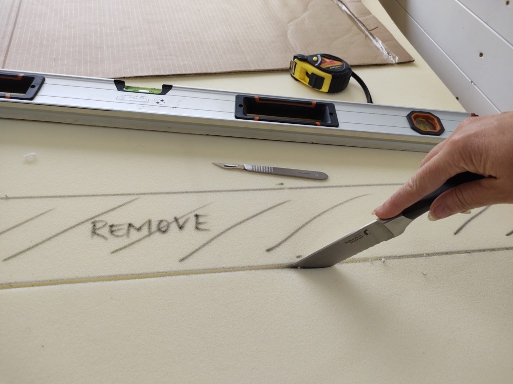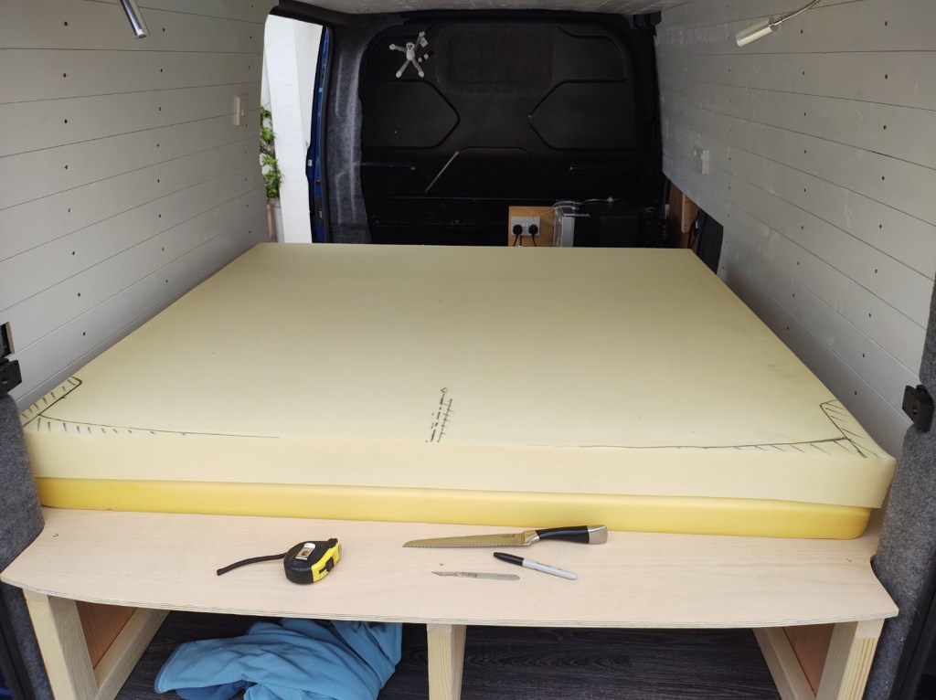 Once we had all the building blocks for the bed complete, it was time to break out the bread knife! I had seen videos of others using an electric bread knife, but we don’t have one of the those, and I wasn’t going to buy one just to make 2 cuts for this project. With trepidation, I had a go with just our plain old manual bread knife from the kitchen. It worked perfectly! I used a sharp scalpel blade along a steel rule to score a clean line a couple of mm deep to follow with the serrated bread knife and used long cutting strokes with minimal force with the serrated blade, starting at one edge and working across. The only slightly tricky part was keeping the knife perpendicular as the mattress is quite thick and made up of 2 layers of different texture foam. I cut the mattress hanging over the edge of the bed platform to keep it flat and evenly supported in the area I was cutting. To keep a clean factory-cut edge across the straight edge (the foot of the bed), I cut a section out of the middle to reduce it from king to double length. I also contoured the head end to match the shape of the rear doors when closed.