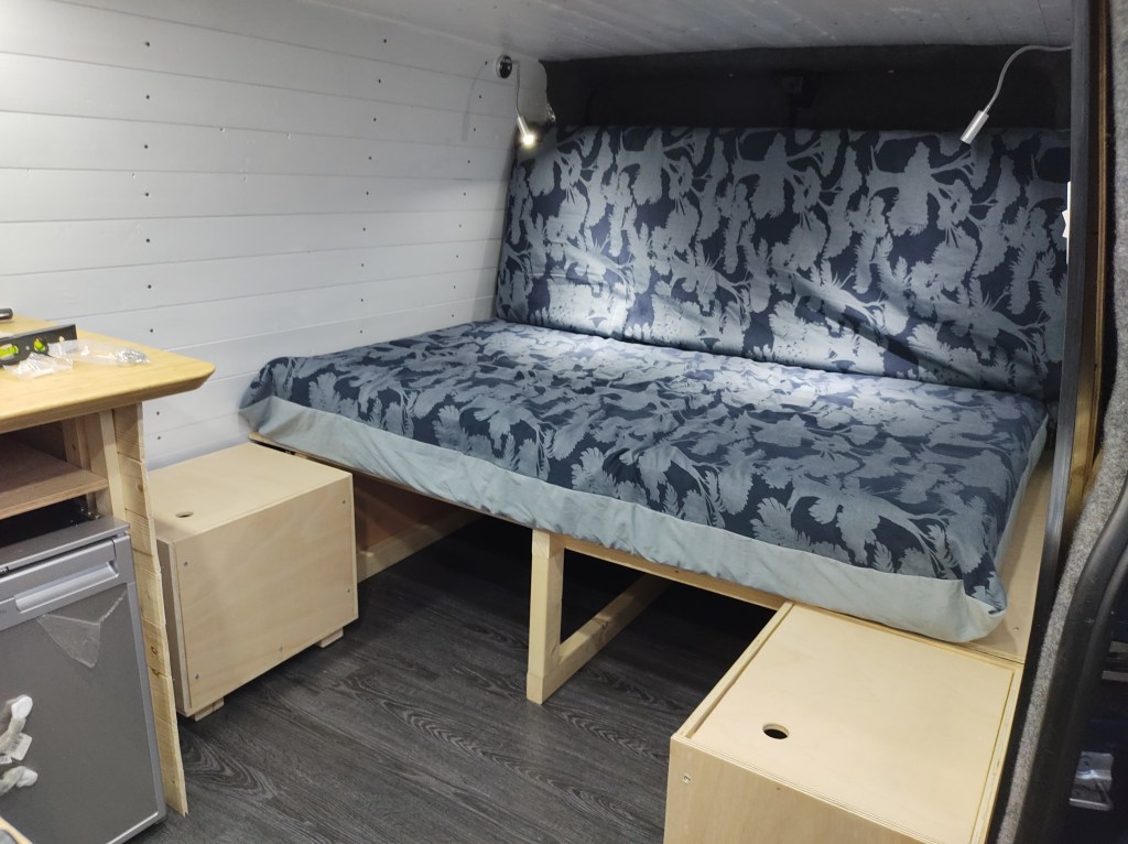 What we hadn’t considered, and want to resolve at some point, is that there is currently no way of retaining the boxes / stools in transit. It would be useful to be able to travel with the van in sofa mode, for quick lunch / tea stops. Without retention for the storage stools, we currently always travel in bed mode. This makes it quick to move on in the mornings, but is not ideal for sitting in to drink a cuppa on route, and even worse if we want to cater for friends when it is raining. It would be cosy for 4, but with the sofa and 2 stools it would be welcome respite from the rain. I have some ideas for how we can do this, but it hasn’t been important enough to rise to the top of the to-do list yet.