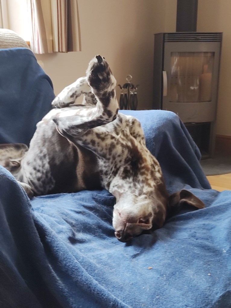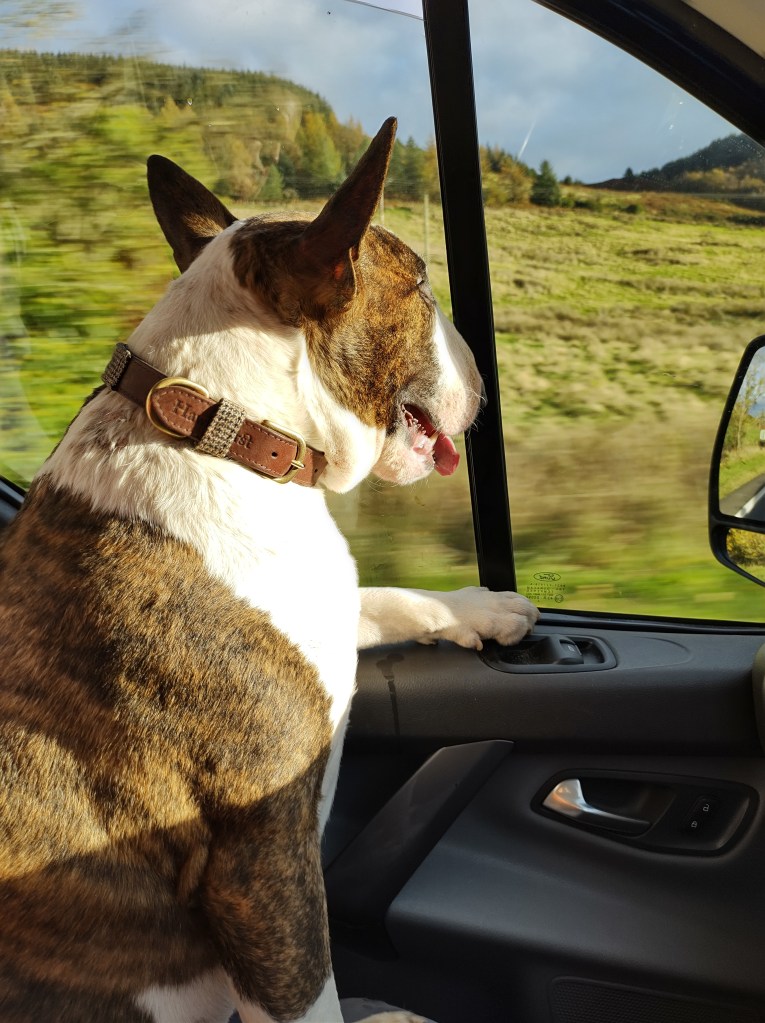 I won’t bore you with all the details, but we ended up driving Bruce over 8hrs up the country from Hertfordshire to Scotland and at the point we picked him up, his owner had no idea who would take over from us at the end of our 2 week stay. On top of this, Bruce had suffered some kind of allergic reaction a few weeks before we met him, and the people looking after him before us had failed to give him the full course of anti-biotics to deal with the resultant skin infection. Poor Bruce was in a pretty sorry state, but thankfully a very good traveller. After a couple of vets visits and steroid and antibiotic injections and follow up tablets, I can confidently say he was in a much better condition physically when we left him. Feeling better definitely brought out his character, and I would mostly describe his character as belligerent. 35Kg of belligerent. He is the only dog we have ever met who prefers a car ride to a walk! Luckily he was relatively easy to bribe with a treat or two.
