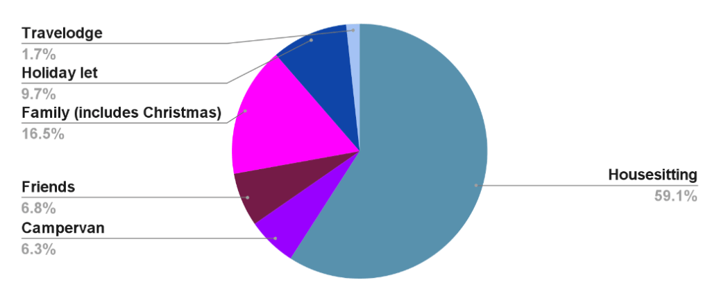 Since moving out, we have spent 176 nights in ‘temporary accommodation’ or one kind or another. The majority of this (104 nights) has been house sitting – for 7 strangers found through an online platform, and 3 friends and family. Looking back, I am surprised we did not use the campervan more. The holiday lets and travelodges crept in at the end of the year when campsite options were limited and we wimped out of sleeping in the van if the underfloor heating wasn’t going to be plugged in.