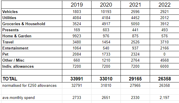 When it comes to expenses, 2022 was our lowest spend year since we started keeping records, despite rampant inflation and a cost of living squeeze. If you have been reading this blog for a while, you will know this is down to a complete change of lifestyle in the second half of the year rather than a major frugal living effort. In fact looking at the numbers, just the fact we have not had any pet-associated expenses this year more than makes up the difference, once the adjustment in annual allowances* is normalised.