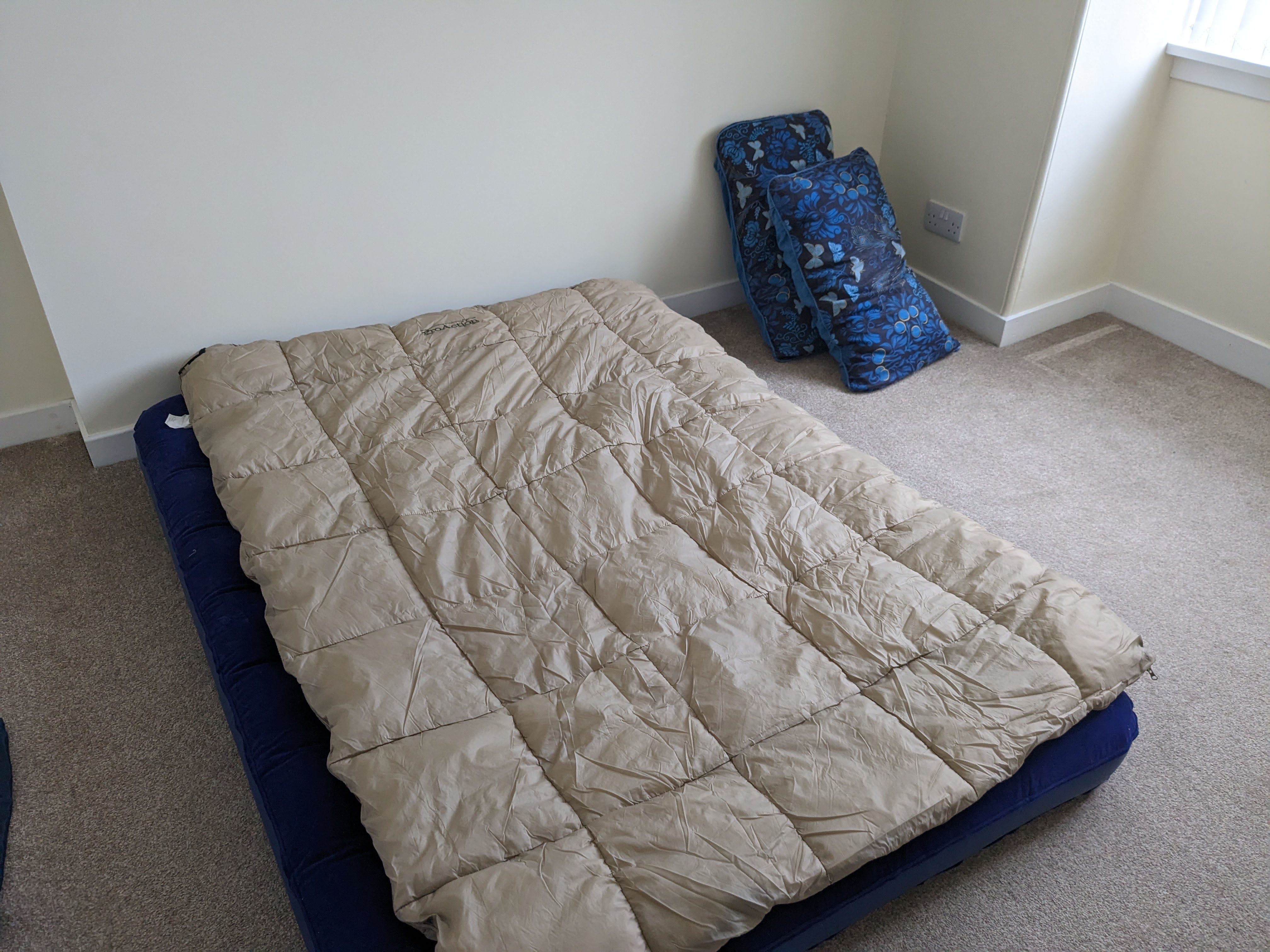 We had to make 2 trips from Hertfordshire to Scotland in a week, firstly to collect the keys and sign off meter readings and a comprehensive condition report (“they mention one mark on the bathroom floor, but not another, should we report it??”). As we didn’t have any of our furniture, nor a camper van, we elected to bring an airbed and sleeping bag and camp in the empty house. Unfortunately, the airbed slowly deflated overnight……