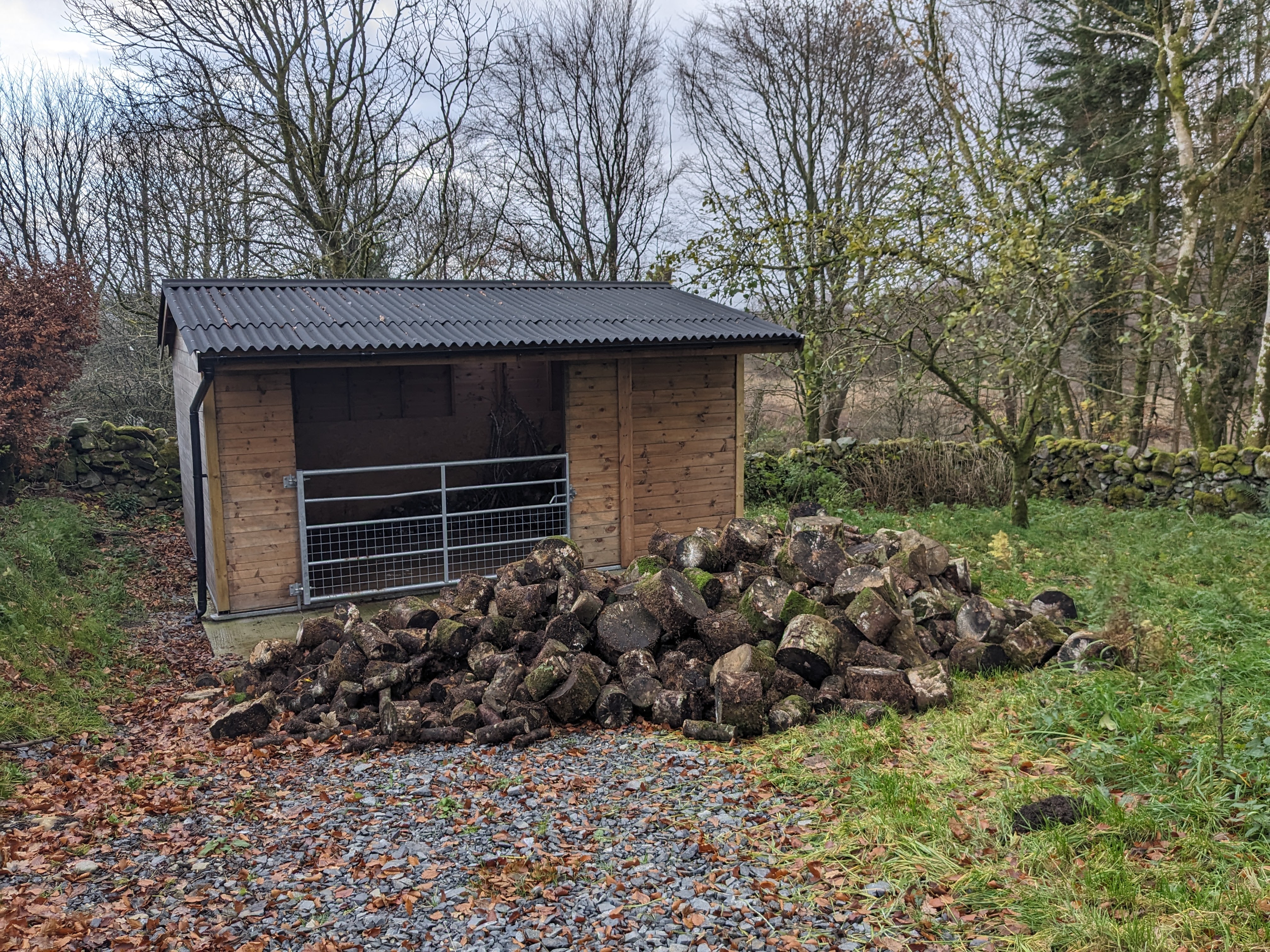 This month mostly revolved around logs, as we tried to get a dry supply of firewood sorted. The previous owner had removed a number of trees, but not done anything with the resultant wood. Apparently sycamore saplings are toxic to donkeys, so she had most of the sycamore trees on the property removed. This meant that there were a LOT of logs lying around in woodland areas which were about a year old and at risk of rotting. With the help of our new farmer neighbour and his tractor and tipper trailer we collected them all up and moved them up a steep hill to the donkey stable which has a concrete floor. We are repurposing it as a log store to allow them all to dry out. It took 3 trailer loads.