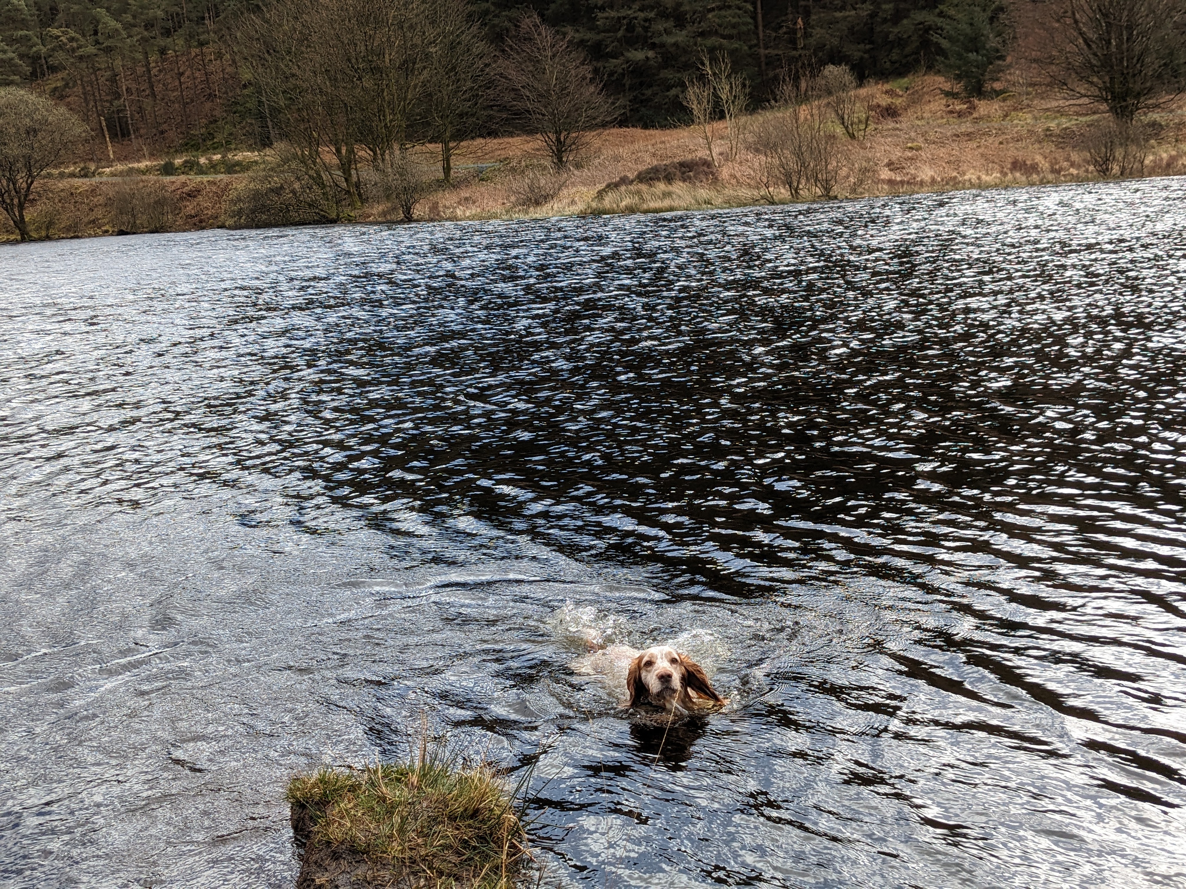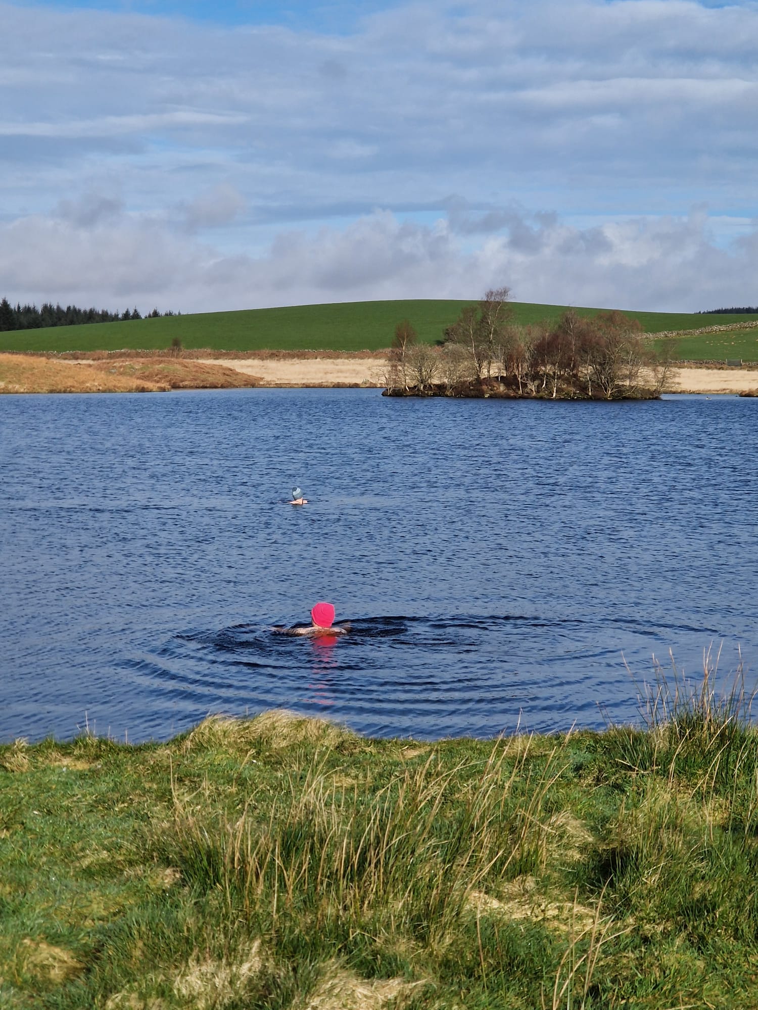Wild swim at least once a month in as many different places as possible – 3 swims this month, all at the local loch. The first was with one of our visiting friends who having seen the loch, decided he wanted to challenge himself. Armed with swim shorts purchased from a local charity shop for £1, loaned wetsuit boots and a pink woolly hat, he did an amazing job for a first dip in April! Even Bert the cocker spaniel got in on the act.