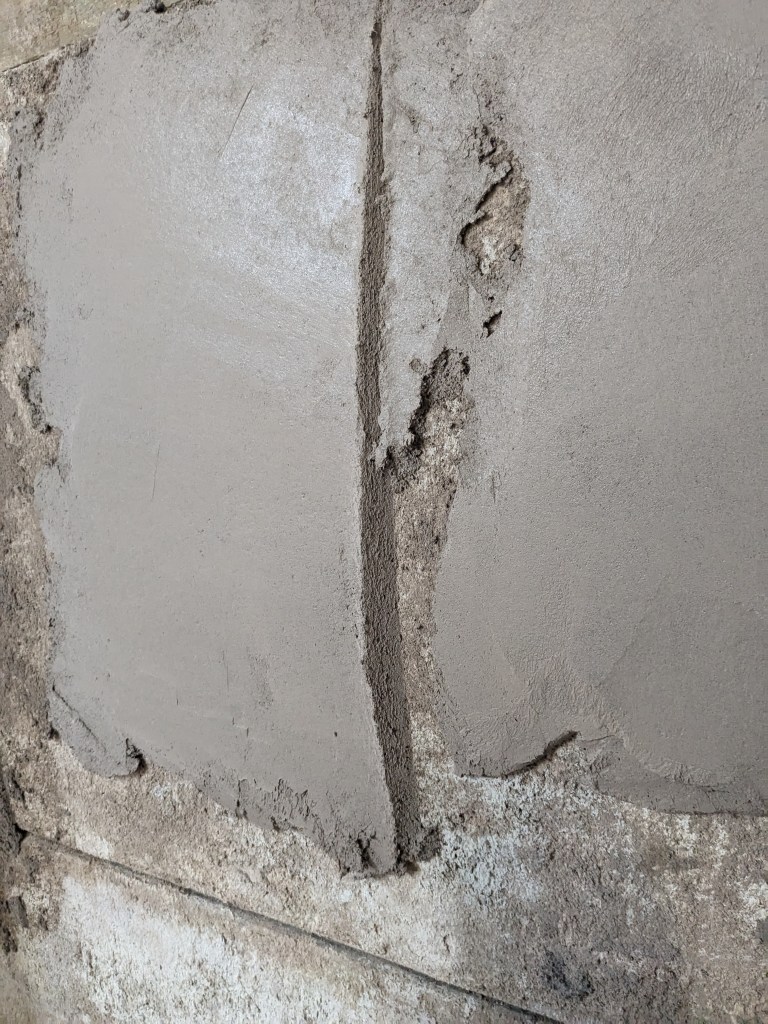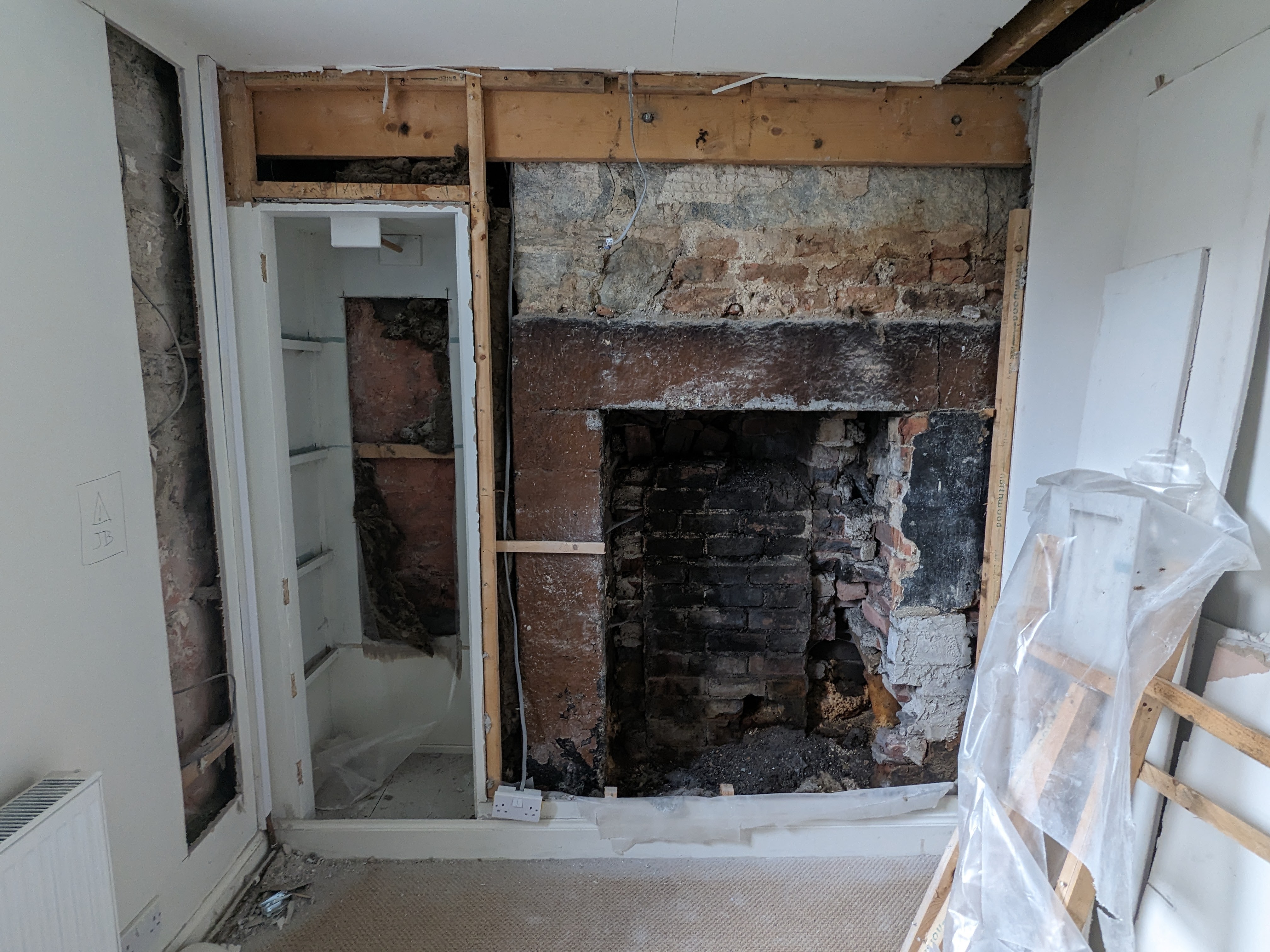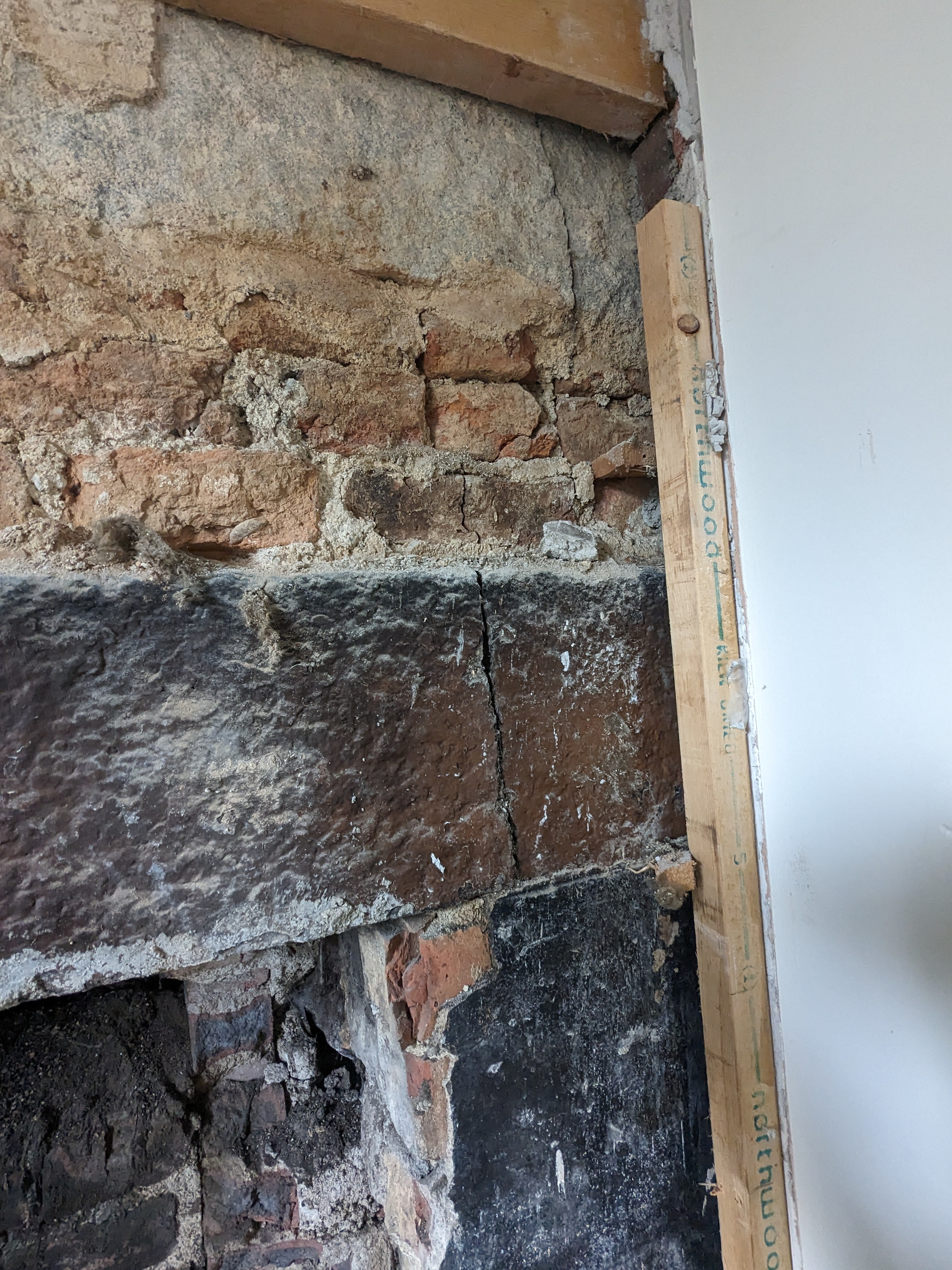 We discovered another, much larger fireplace. This extends beyond the dividing wall to the room next door (the areas with brown paint). It seems the beam for the floor above is bolted into the chimney breast above the fireplace in 2 places. The right hand bolt appears to be the origin of a large crack which propagates downwards and right through the solid granite fireplace lintel :-(. We suspect the crack has been there a long time, as someone has tried to support the lintel under the crack with a very poorly constructed pile of bricks and cement (not sure I can really call it a wall). This ‘support’ is in line with the dividing wall. The vent in the chimney that is visible outside has been bricked over in the back of the fire opening – we think there was probably some kind of range in the space in the past. This all explains why the damp was most visible where this internal dividing wall meets the external wall.