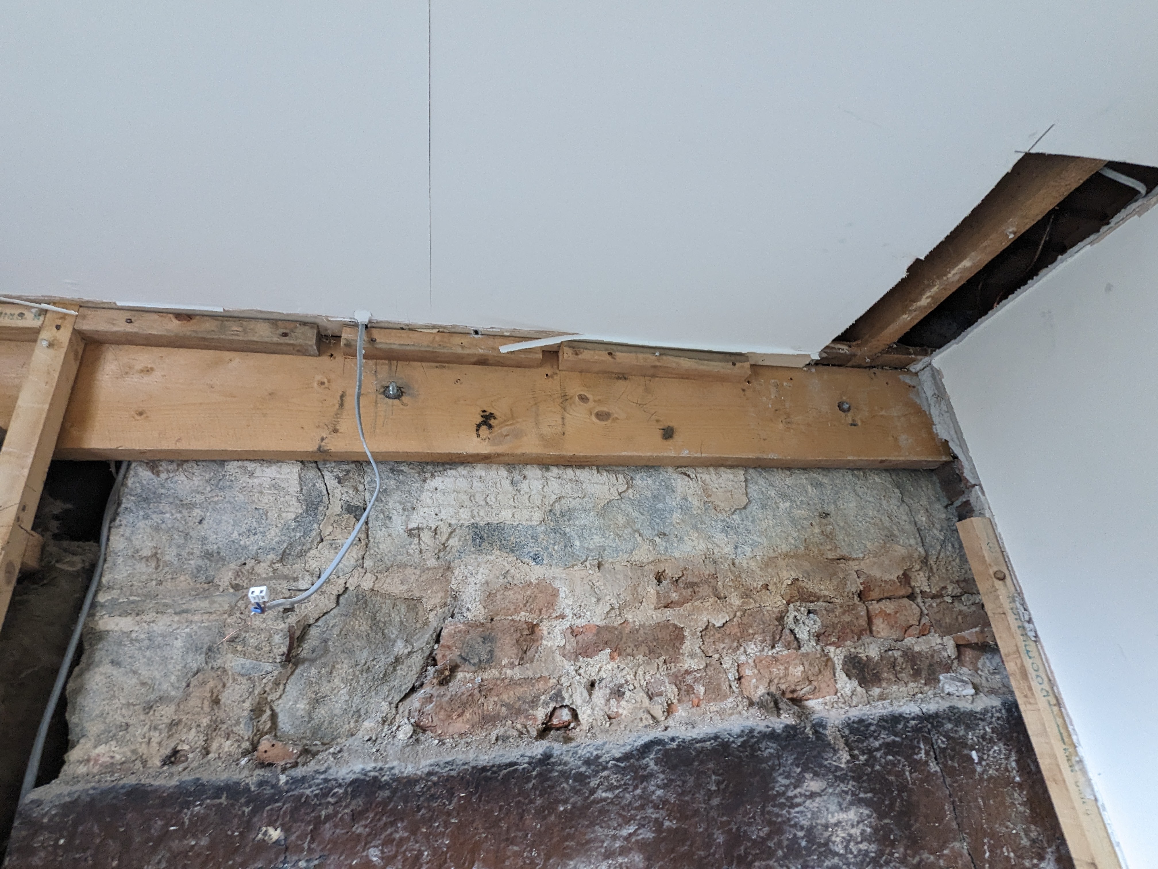 Once they headed home, we had a couple of days before the lime course we were booked on in Cumbria. We decided to make a bit more progress with removing the plasterboard in the downstairs bedroom we started on in March. Unfortunately, when assessing the best way to start on the next wall, we realised that the main beam holding up the floor above was not actually tied into the external wall. Essentially, all that was holding the upstairs floor up in that corner was the plasterboard framing we had just removed 😱