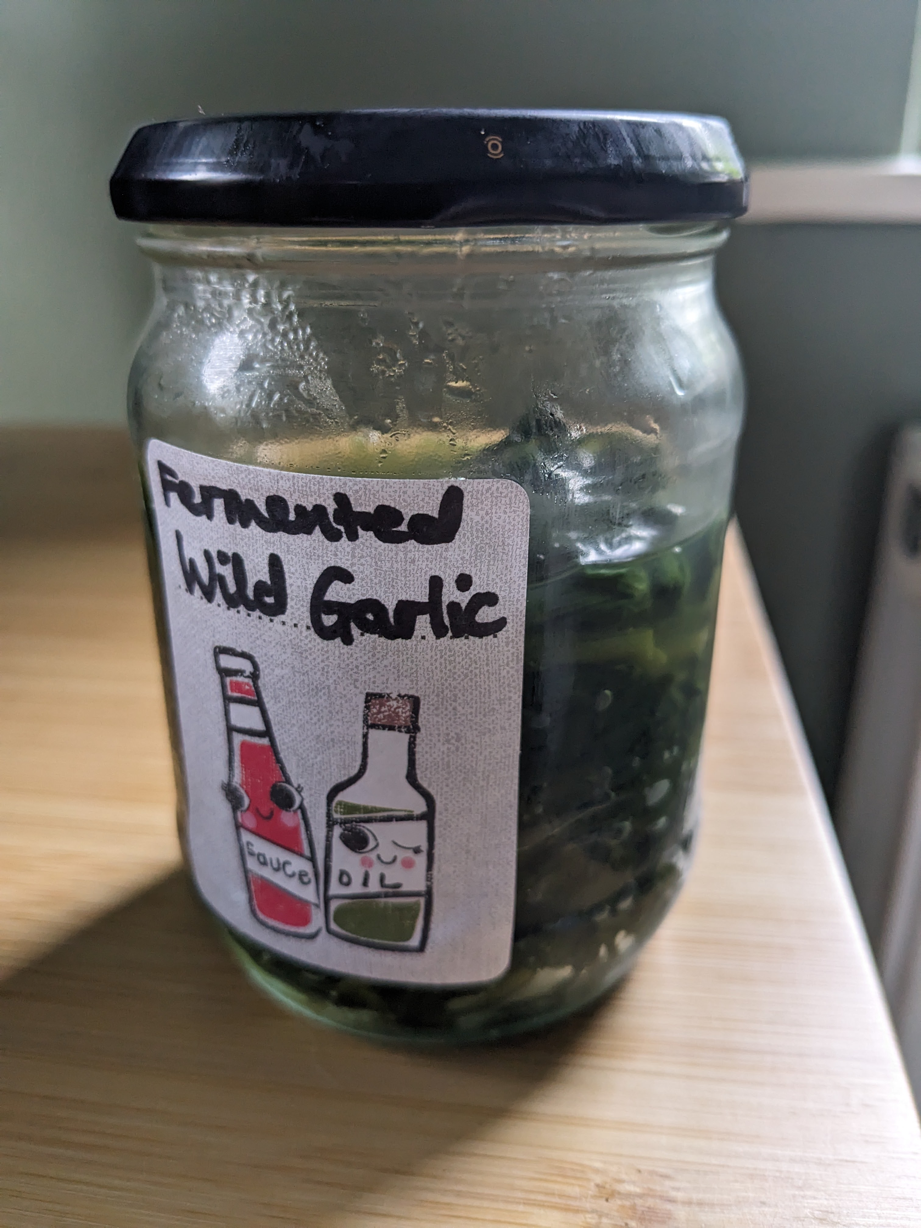 I tried out lacto-fermentation for the first time, as recommended by the leader of the foraging day we did last September. It is a very simple process, using 4-6% salt and the resultant fermented wild garlic should keep for over a year. I haven’t used any yet.