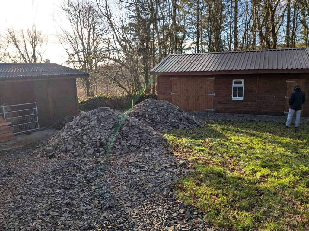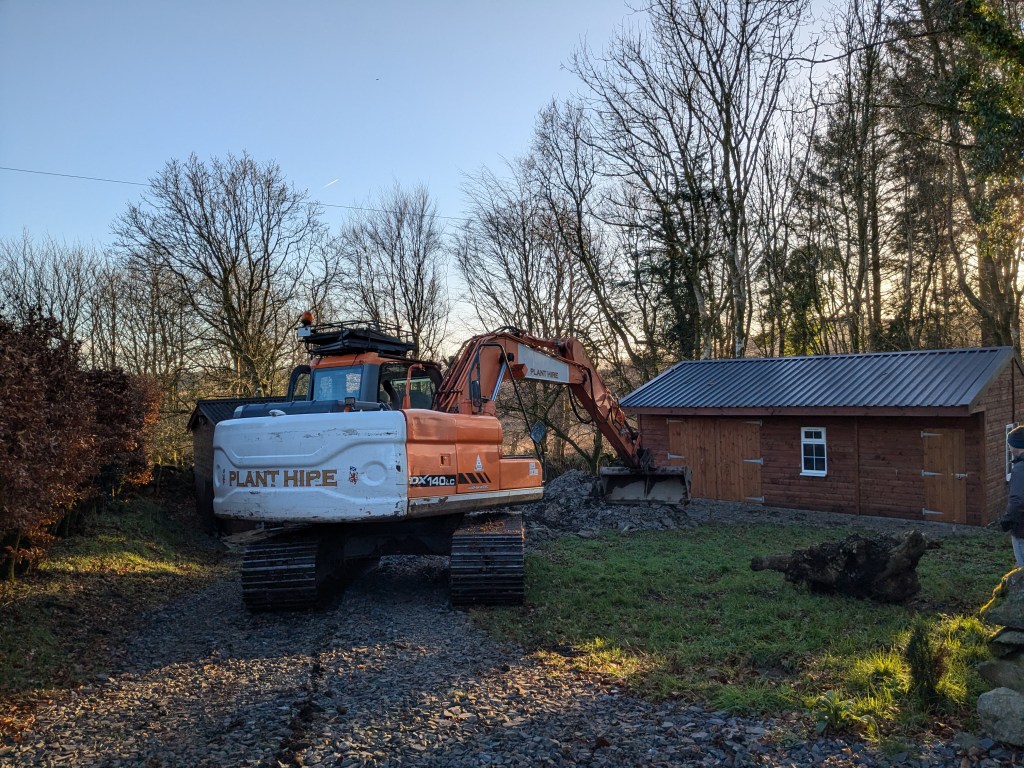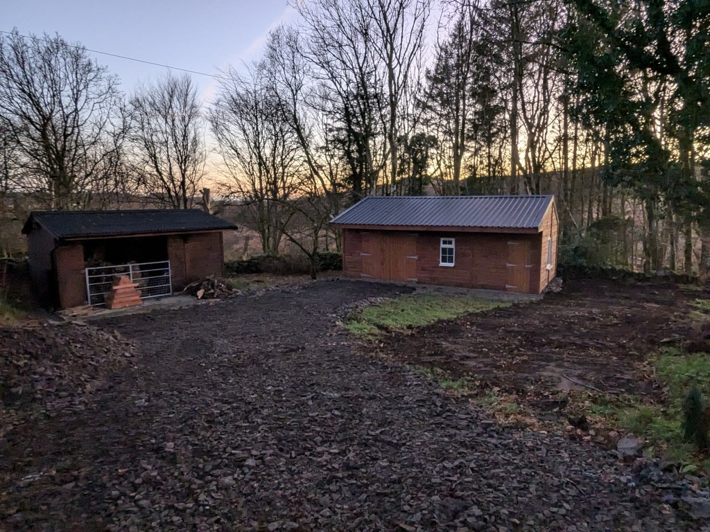 We did make a little progress on the house, when the landscaping around the new garage was finally finished. The local sawmill (who built it) had been waiting for their mini-digger to be repaired. They finally gave up waiting, and a very skilled operator managed to get up the track and navigated all the narrow openings in drystone walls in a massive full size digger! Rather him than me, but he did an excellent job and we even have a little stone left for running repairs on the track. The very helpful chap also levelled the ground to the right of the garage, where we plan to erect a polytunnel – eventually.