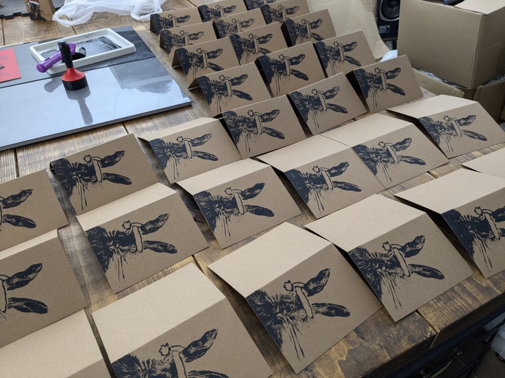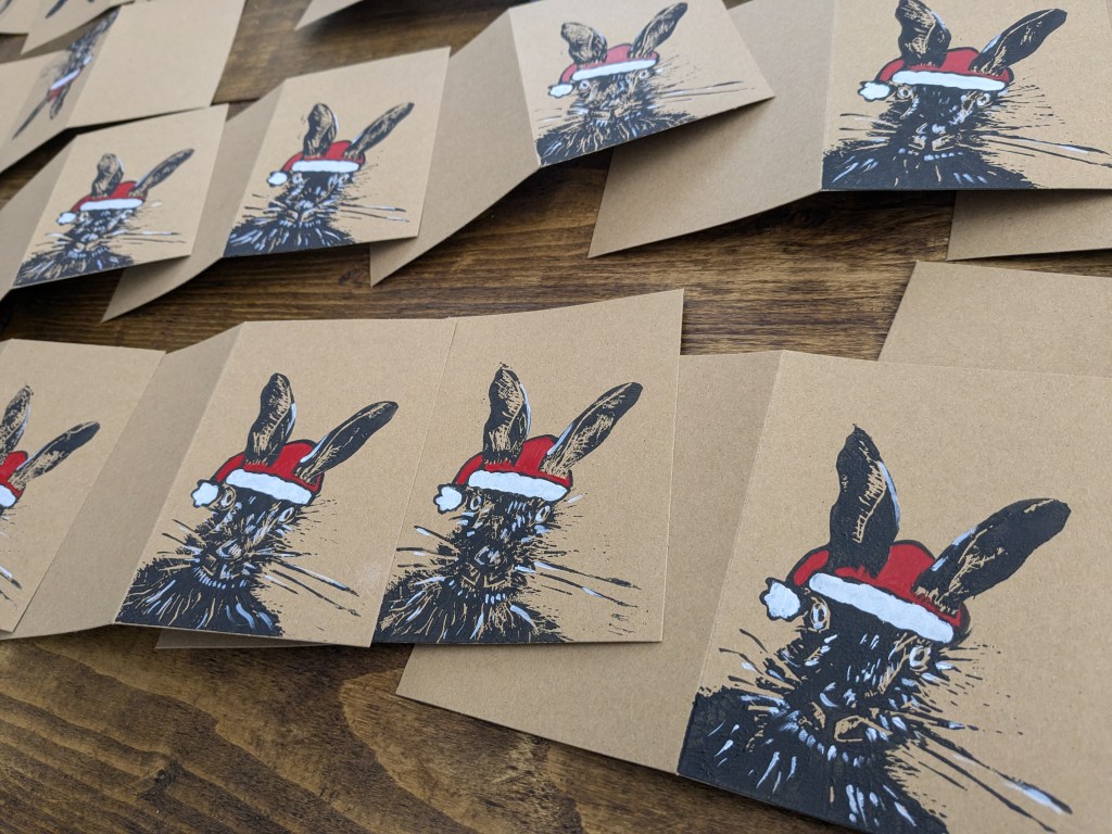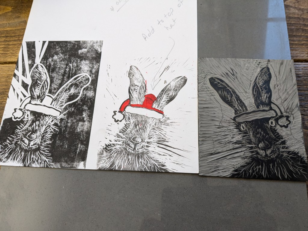 Like our living room, the only heating in the small converted barn studio is a wood burner. Unlike the living room, the stove in there is more form than function, so it takes ages to heat the space and the concrete floors and high ceilings make it quite chilly. Once I got into the flow, I didn’t really notice. I think a lot of artists in this part of the world work in hats and coats. I wanted to do something inspired by local wildlife and thought the most appropriate for 2024 was a festive hare to reflect the many that wander close to the house. I think it worked out fairly well for a first attempt in quite a while.