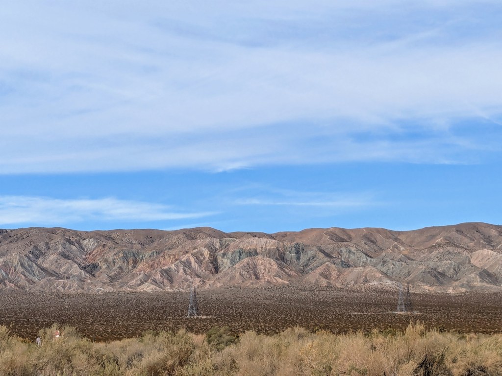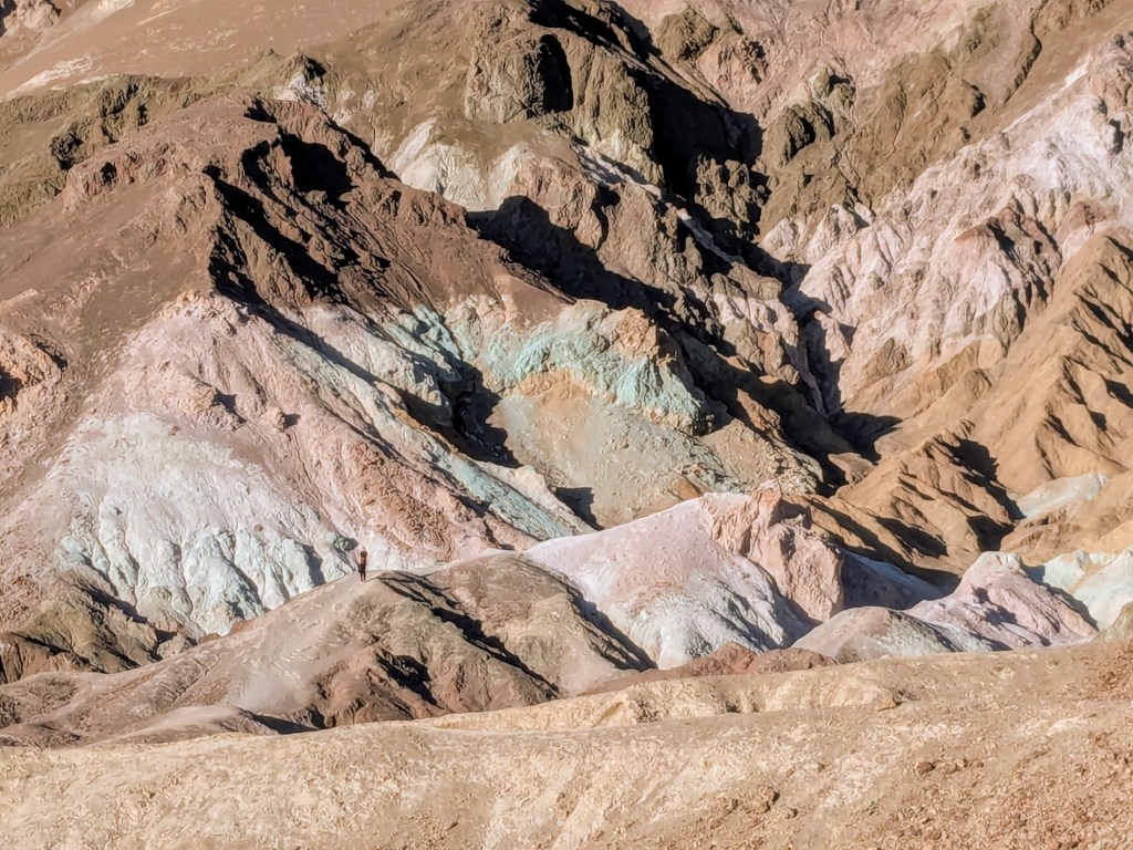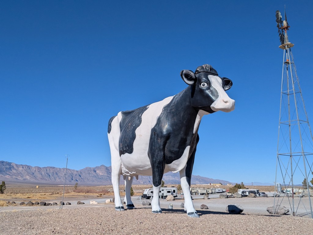 This set the tone for next 3 days, different desert and rocky landscapes, all huge in scale and very few people. Those we did see were concentrated around visitor centres. Death Velley was a very pleasant 25 deg C. I don’t think we would have been tempted to go during the oppressive summer heat. We nipped over the border into Nevada before heading on to the Mojave desert, as it was only a 7 mile detour. We took advantage of the much cheaper fuel prices and had breakfast in a casino with a giant fibreglass cow in the car park. The big bovine of the desert was one of those unexpected roadside novelties that makes an American road trip fun. It cooled slightly as we headed into the Mojave desert and Joshua Tree National Park, but the sunny dry days were quite a contrast to SW Scotland in late winter.