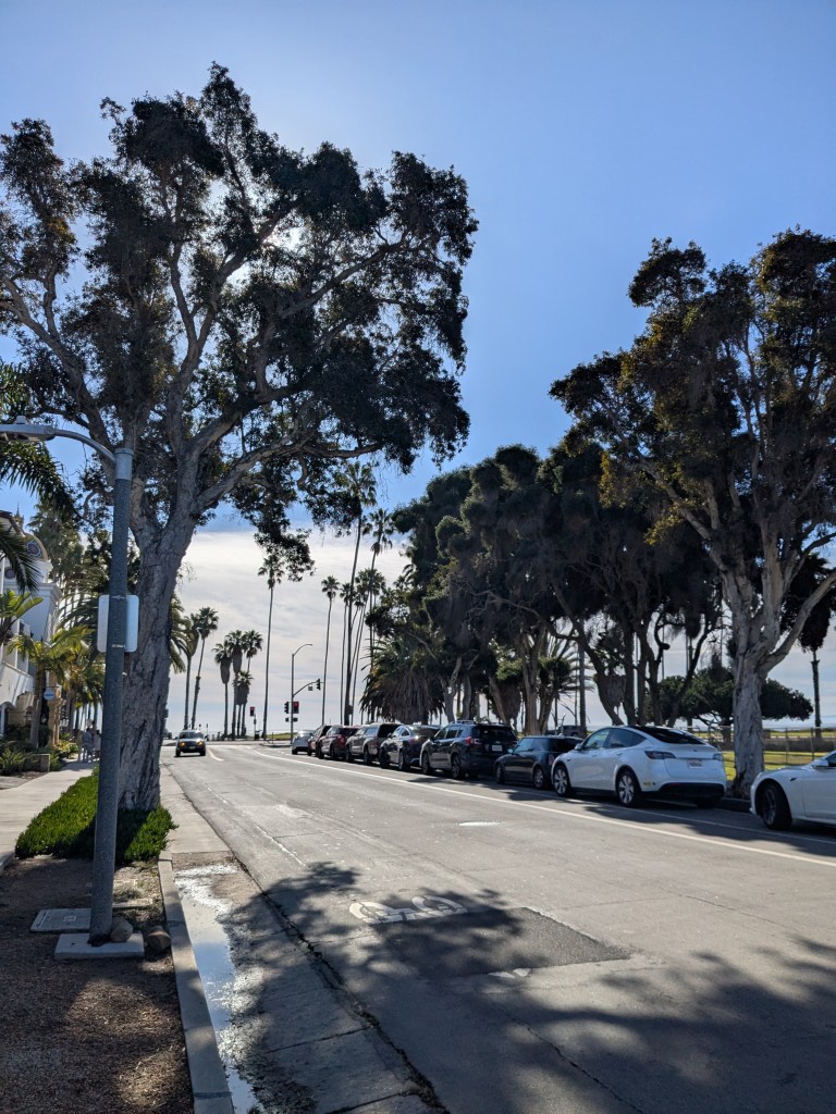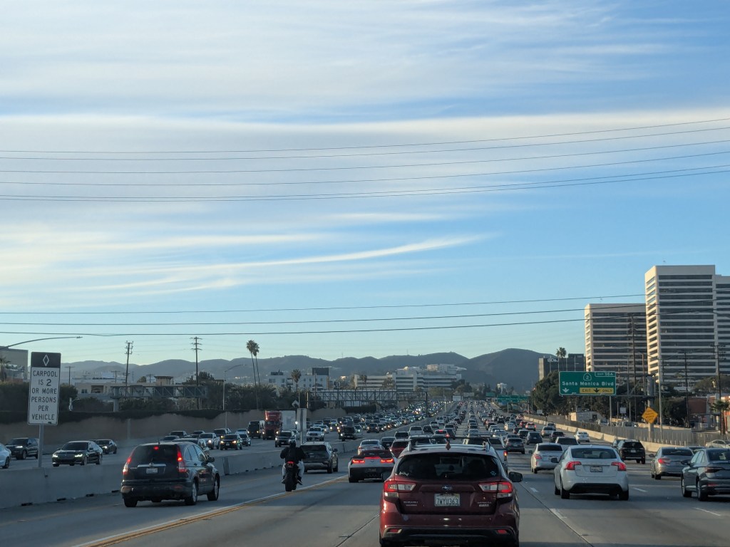 I fancied a trip up the Pacific Coast Highway, but the aftermath of the Palisades fire meant most of the stretch we could reach, was closed. By the time we had crawled through very authentic LA traffic (catching a brief glimpse of the Hollywood sign in the hazy distance between tower blocks), it was sunset by the time we reached Highway 1 north of Malibu. The sunset was spectacular, but difficult to fully appreciate whilst driving.