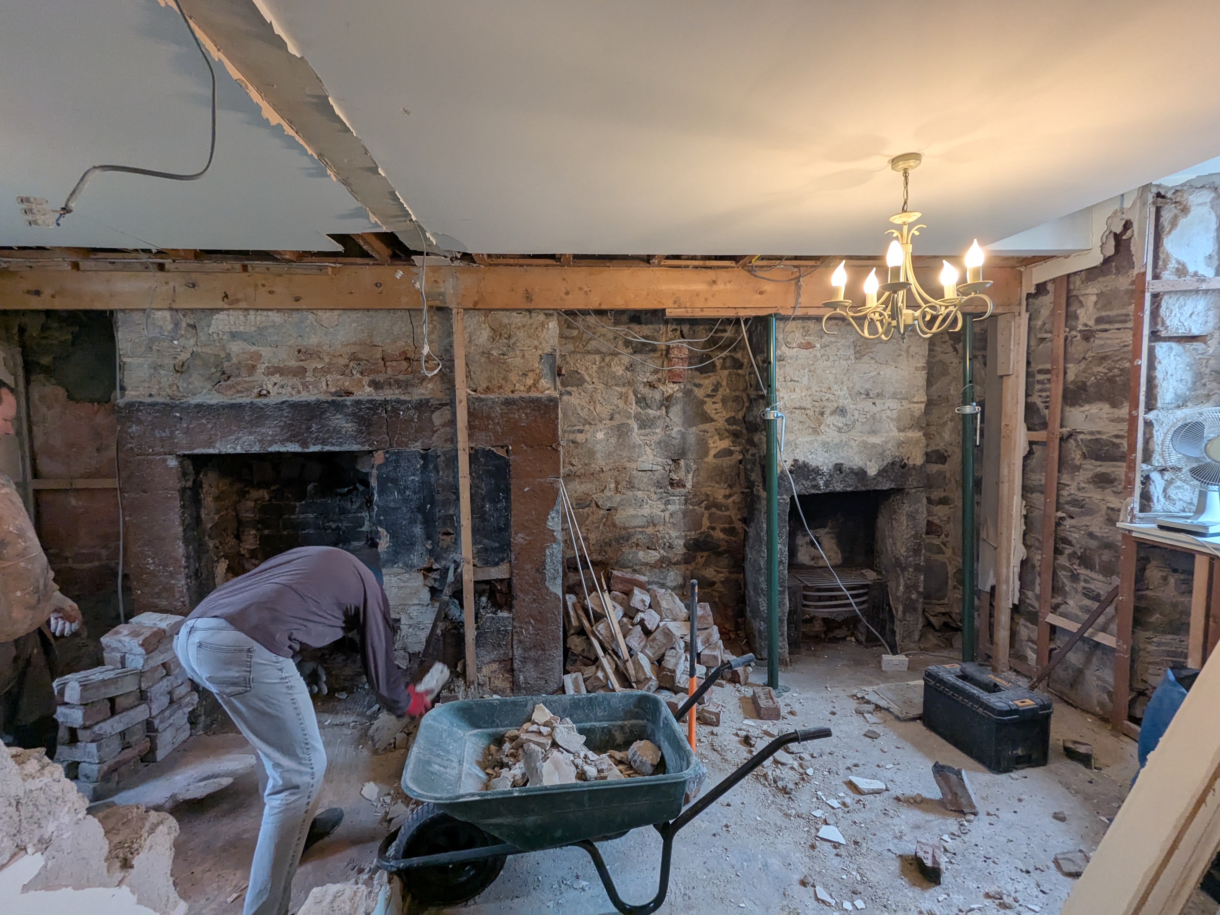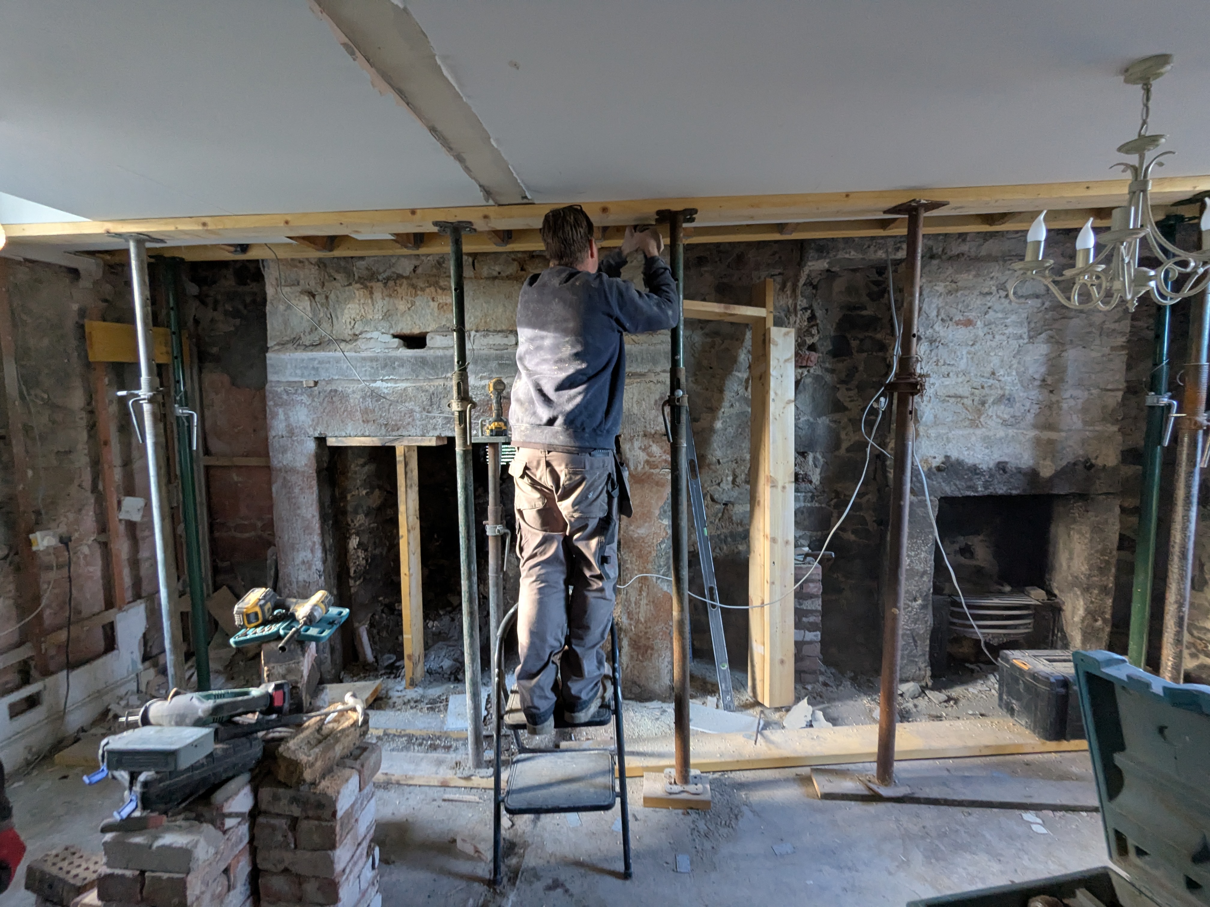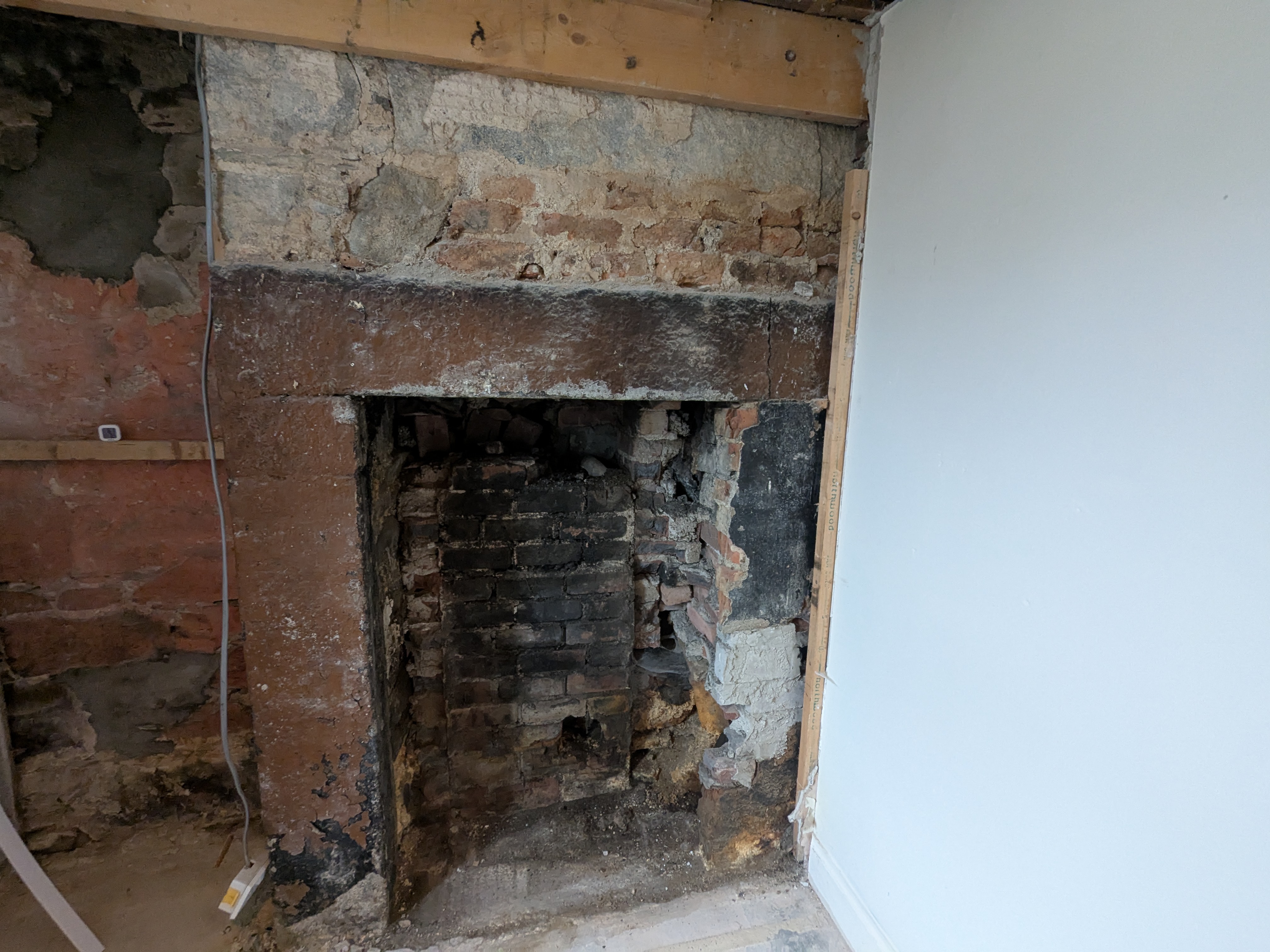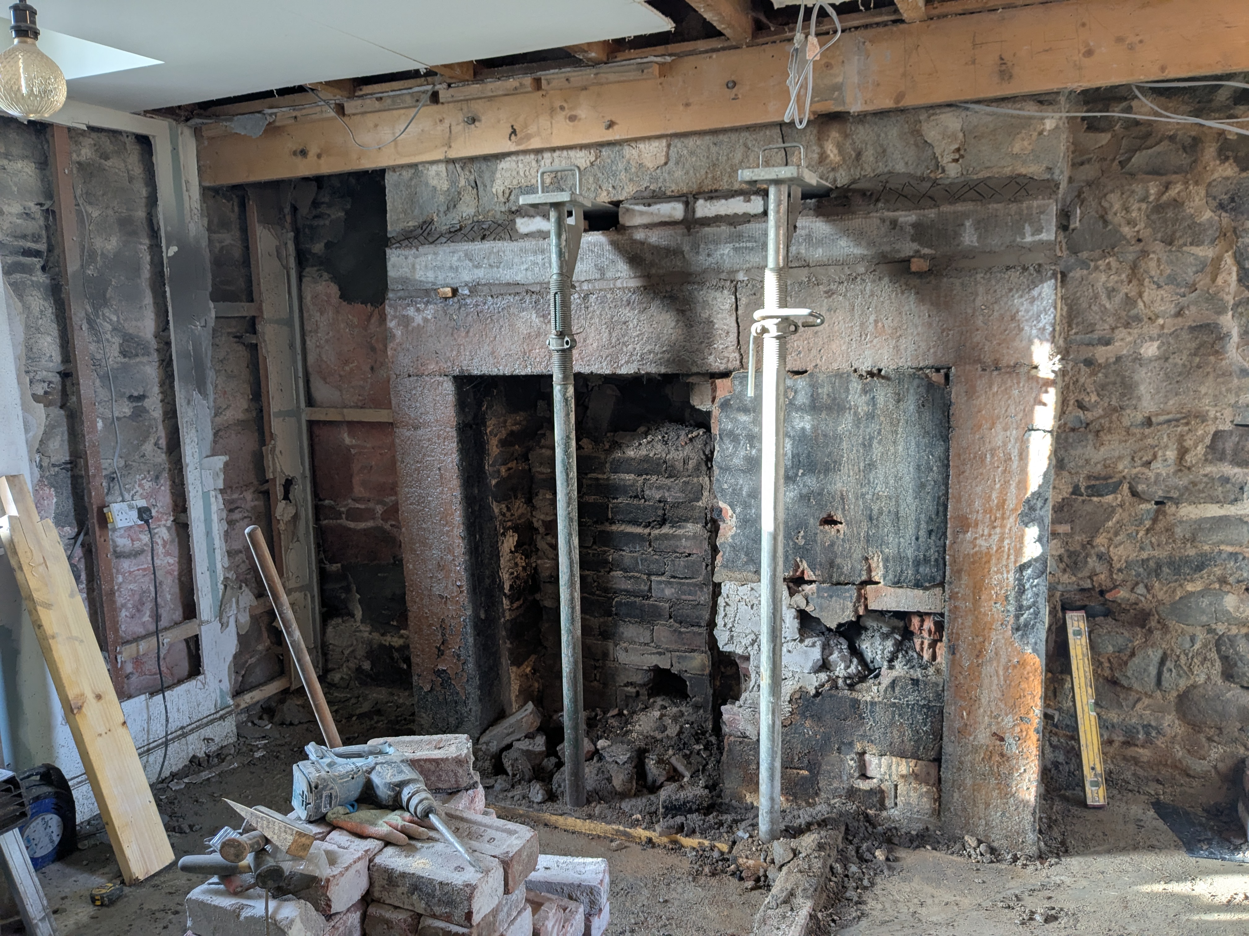 We are now just waiting for a local stonemason to be available to repair the cracked granite lintel across the large fireplace with stainless rods and resin. It all seems to be drying out nicely and I have specified the insulated lime plaster we will use inside with the lime supplier. We just need to wait for slightly warmer weather to be able to remove the vent in the back of the chimney and fill the hole with stone and lime mortar. Then it should be all systems go putting the room back together.