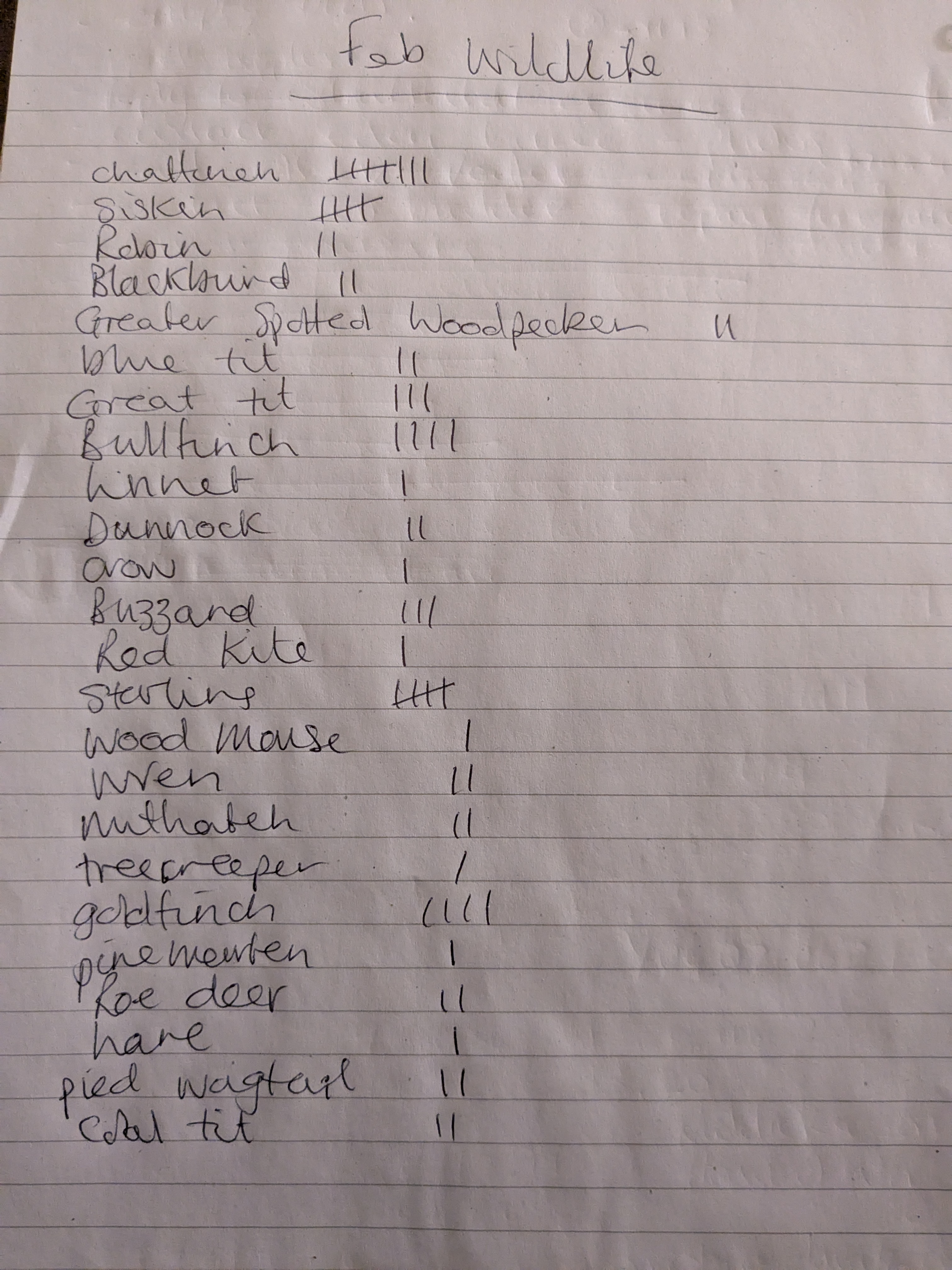 Record the birds and mammals spotted around the house each month – I have seen it done at nature reserves and National Trust properties and I want to do my own experiment. I want to capture the changing seasons, see when migrants arrive and leave and how that changes over the seasons. I will do this with a small board or dedicated diary eventually, but for now it is a notepad. The rules are the same as the RSPB big garden bird watch, you only record the number of creatures you see at the same time.
