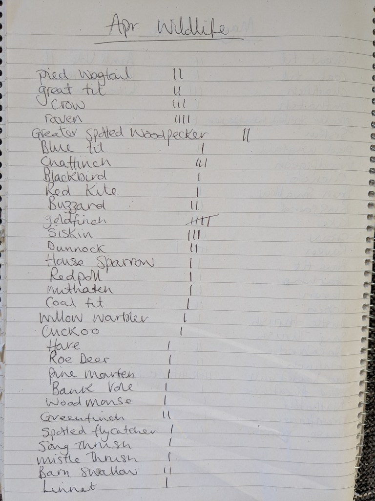 Record the birds and mammals spotted around the house each month – despite not being here for a good chunk of the month, the tally for April is still quite impressive, with a lot of migrant birds returning that haven’t been seen for months.