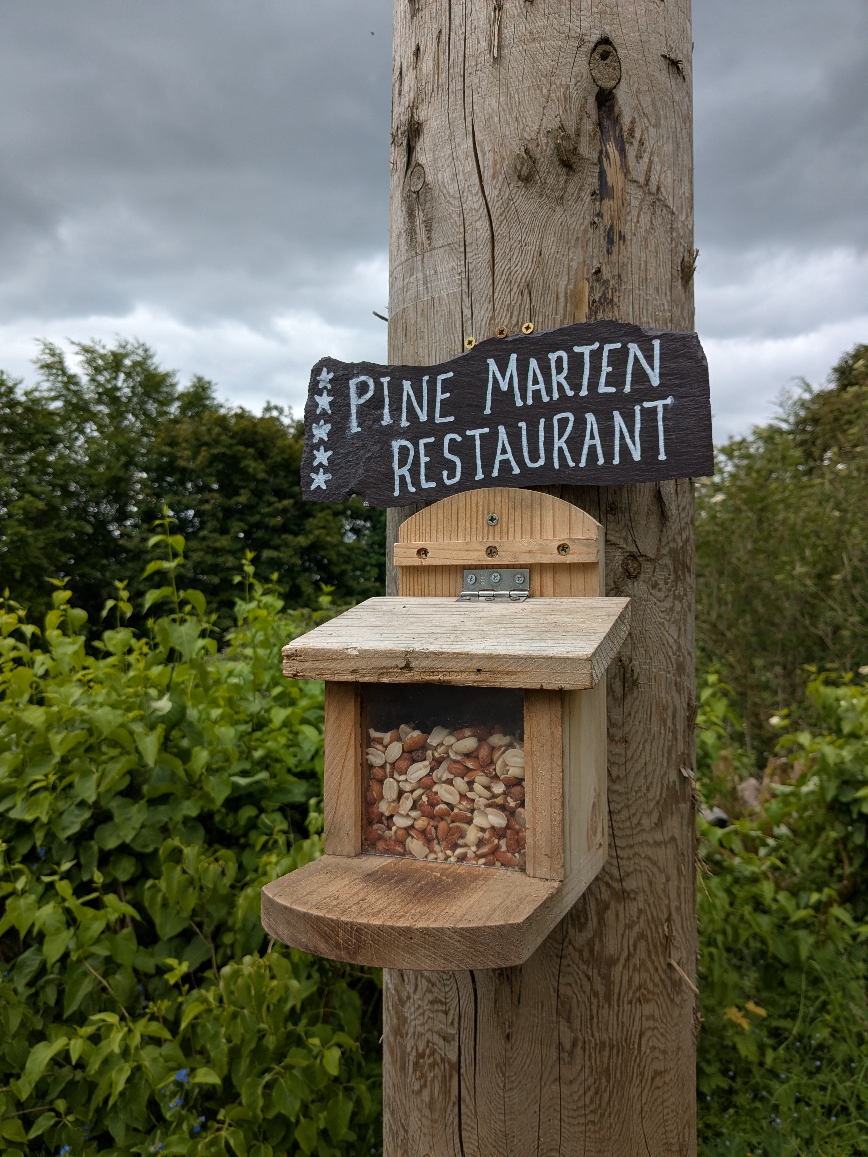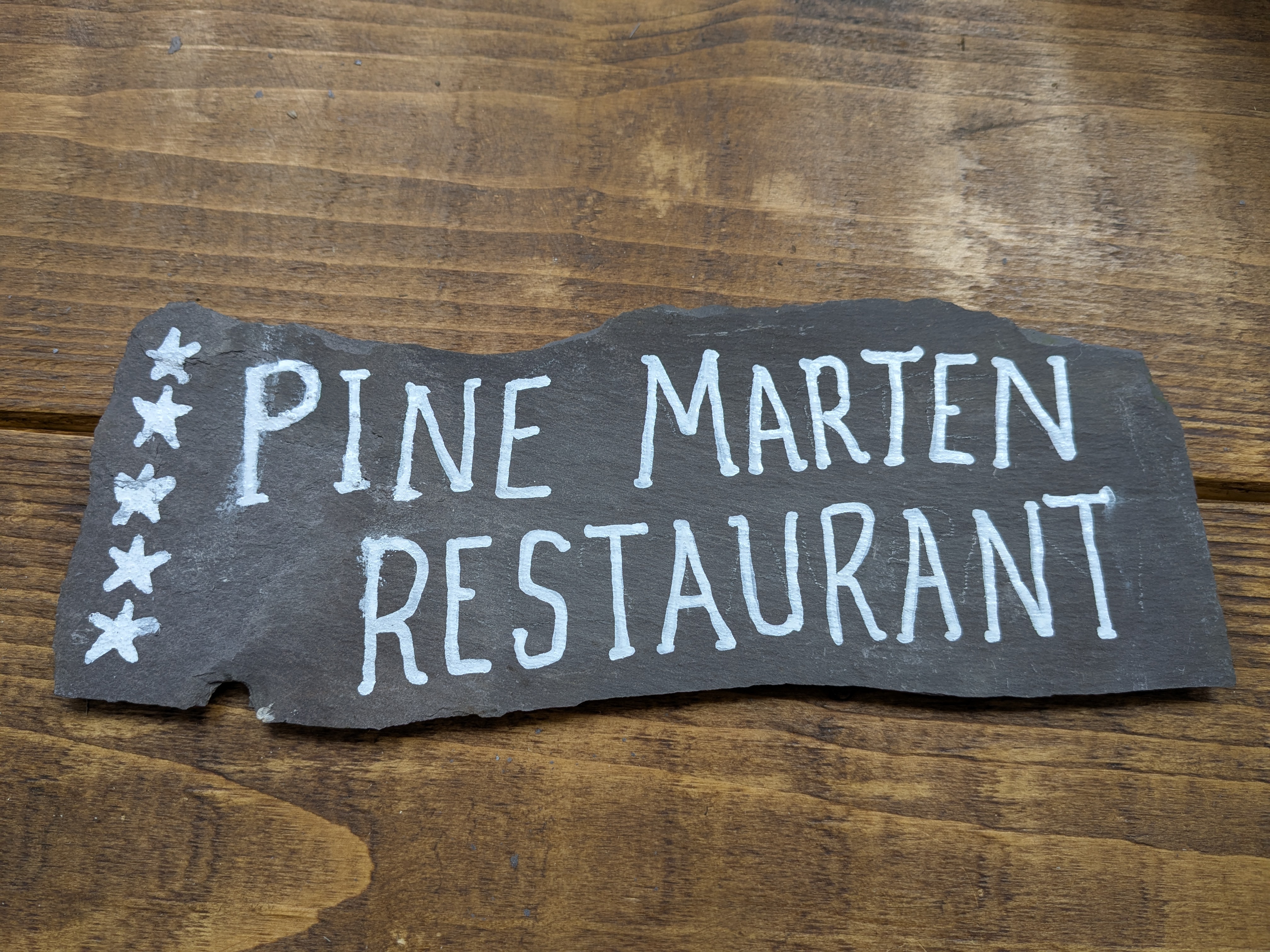 Do something creative every month – I had to cancel the outdoor sketching session I had planned with a local art group, due to illness, which I was really disappointed about. I have bought some new art materials to experiment with, but not actually used them yet 🙄. I did make one very silly project using materials I already had – part of an old roofing slate, a chalk pen and some car lacquer. Sadly I failed to come up with any peanut or pine marten based restaurant puns, so kept it simple.
