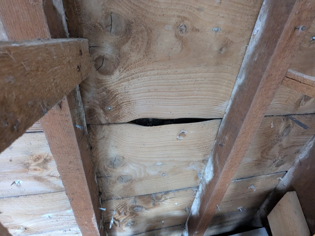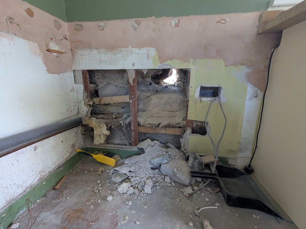 We stripped it all back ourselves, removed the ancient rockwool, which wasn’t nearly as damp as we feared, but did contain quite a lot of bat poo. Removing all the plasterboard also gave us the chance to inspect the roof from inside. We had braced ourselves to discover all kinds of expensive horrors. In fact, it was in pretty good shape and we were surprised to find original sarking, having assumed the roof would have been replaced at some point in the last 250+ years. The boards are much wider and thicker than modern equivalents and you can still see some bark on waney edges! There were some modern alterations around the velux windows (most of which will need replacing fairly soon), and some evidence of historic woodworm, but thankfully nothing active or serious. We discovered that the original upstairs fireplace had been blocked up, which was a shame as we knew there had to be one behind the plasterboard on this wall somewhere. We would like to lime plaster this gable end wall at some point, so we may try to open it up then.