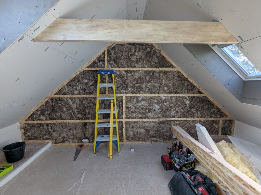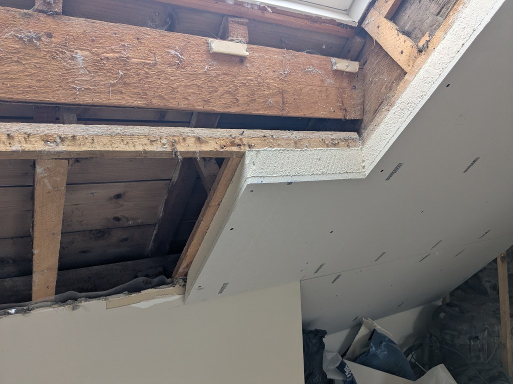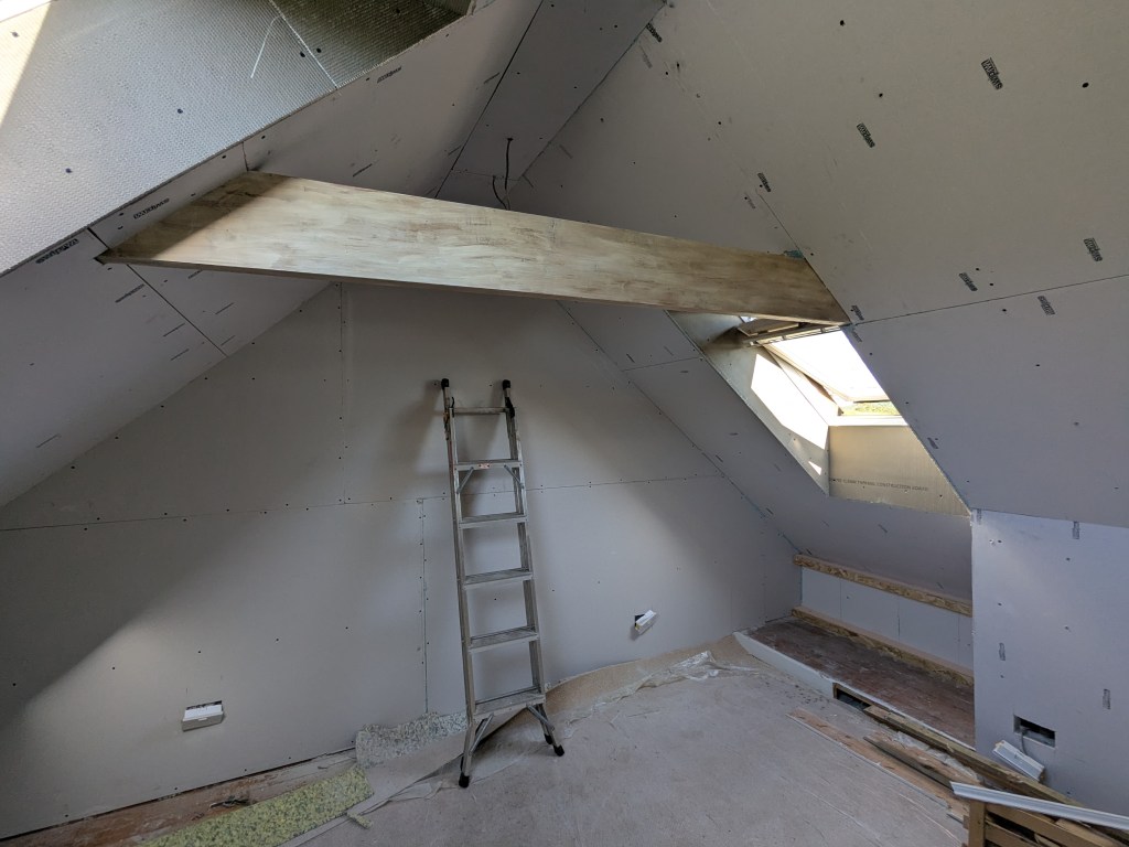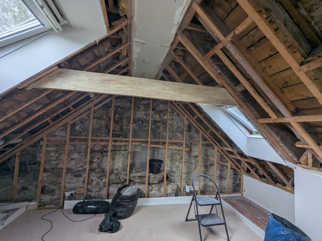We didn’t want internal wall insulation on our solid walls downstairs, but we agreed to ‘room-in-roof’ insulation in the bedrooms upstairs. This consists of SWIP board on all the sloping ceilings – which is essentially foil backed rigid foam insulation board with plasterboard bonded to it. They also replaced the loft insulation above the small flat section of ceiling and fibre insulation at the gable ends. They would have just gone over the top of what was there, but we suspected there was old damp loft insulation right up against the underside of the roof under the plasterboard that we wanted to remove first, to improve ventilation.