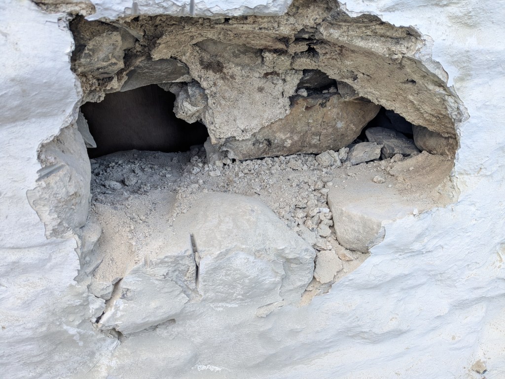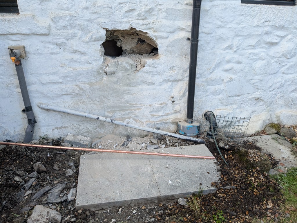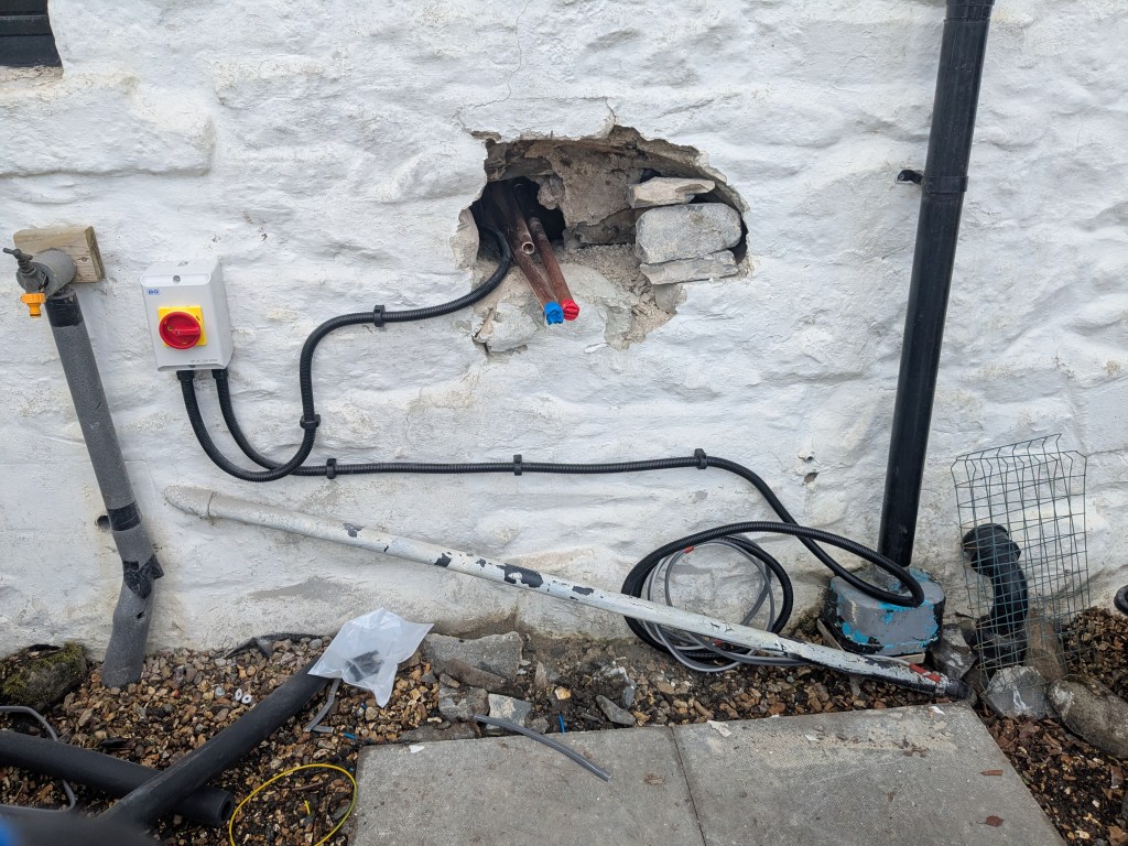 They made a larger-than-planned hole in the wall between the cylinder and heat pump, when they had to remove several large granite blocks after trying to cut through for several hours didn’t get them very far. I stopped them filling the hole with cement, and am half way through filling the void with stone and lime mortar. A tricky job, when you can only access a half meter thick wall from the outside. My arms are just long enough, but I am having to do it by feel and the restricted space behind the heat pump makes it a bit of a contortionist’s trick.