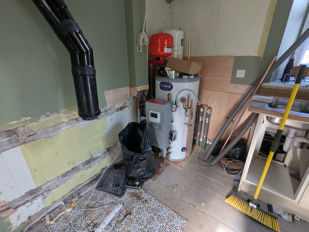 While one team were tackling the insulation upstairs, the plumbers installed the heat pump and hot water cylinder quickly, but it took a little longer to be commissioned. The new hot water cylinder wouldn’t fit in the cupboard upstairs that we had so carefully fitted the replacement stainless tank into in July. We elected to fit it in the corner of the kitchen, the other side of the wall from the heat pump. This unfortunately meant a lot more disruption, and ripping out the only wall cupboards we had, in an already storage-deficient kitchen. The plumber did an amazing job of routing the pipework close to the cylinder to leave space for the washing machine next to it, on the only wall with drainage. I am sure he went home and complained to his family about how awkward and time consuming it was, but we were very grateful.