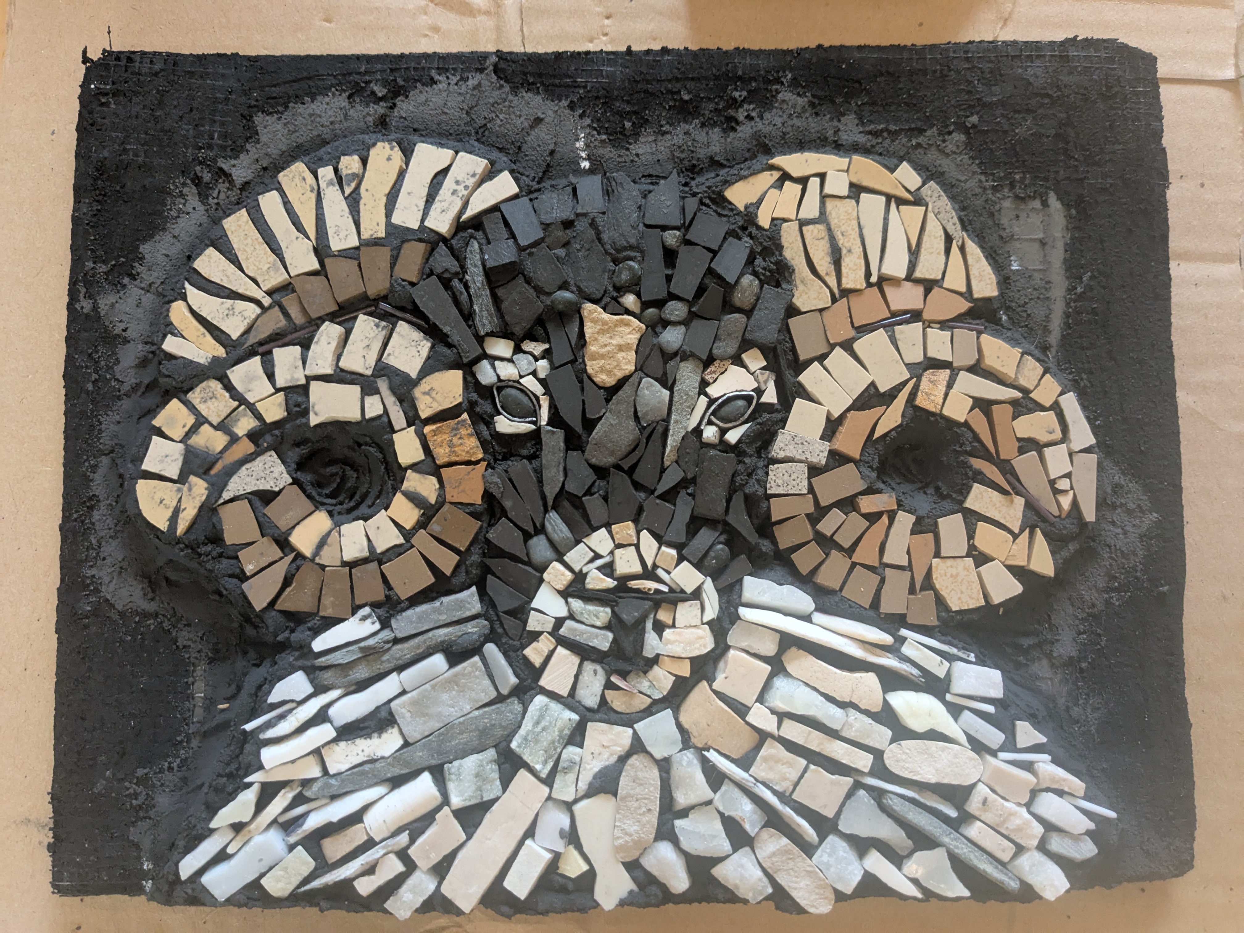 Do something creative every month – I made time for 2 workshops in September. Whilst in Cumbria with a crafty friend, we both spent the day learning how to create mosaics. I was very pleased with how mine turned out. It is based on a photo of a Scottish Blackface ram I took a couple of years ago. I ran out of time on the day, but I brought home some blue pieces and tile adhesive to finish the background (once I have a bench or table accessible to do it!)