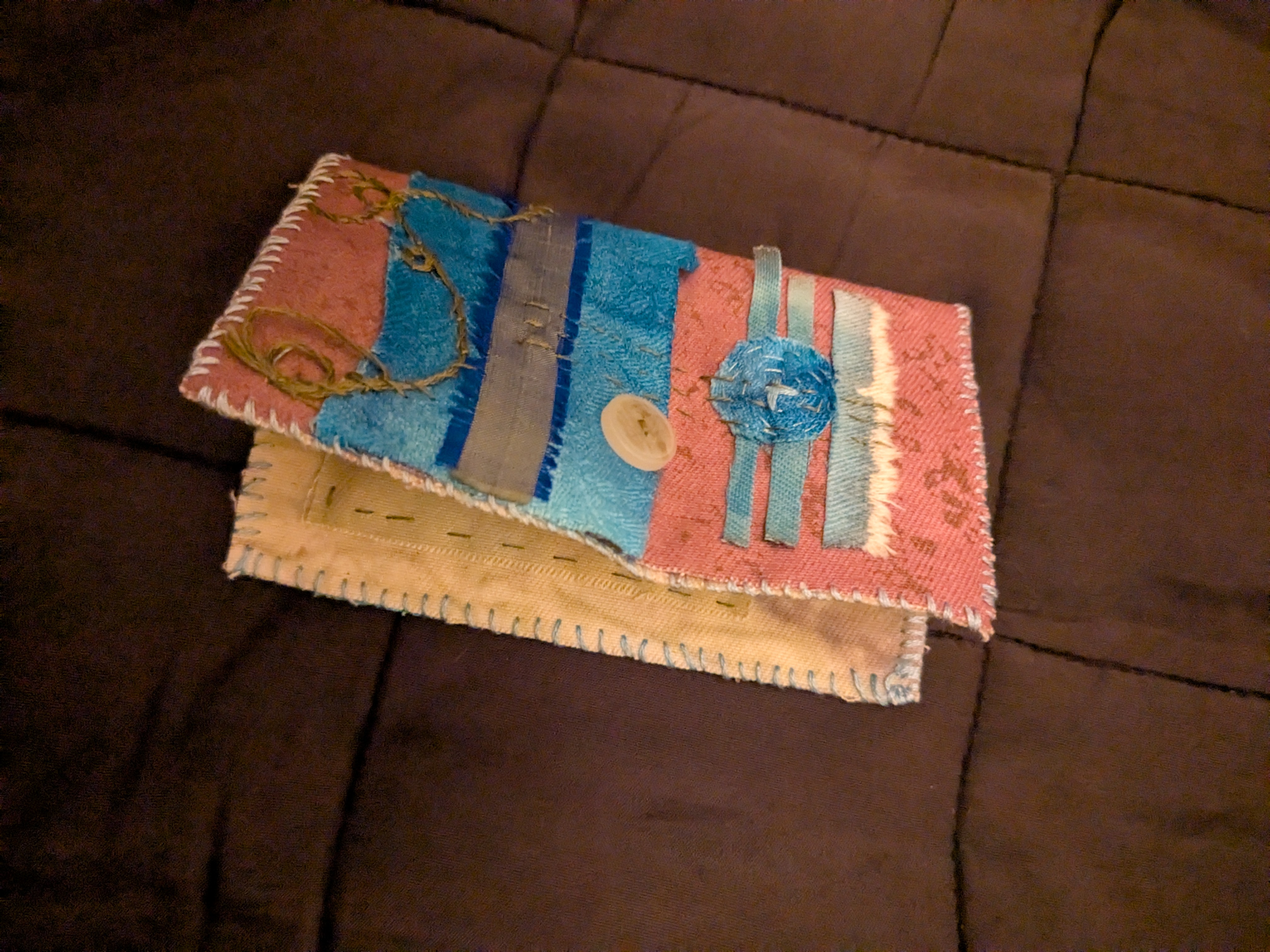 The other workshop was a very informal evening affair hosted by one of my local art group. She is a (very talented) textile artist, but sewing really isn’t a skill of mine. I was really only in it for the social aspect. She showed us all how to make a ‘memory pocket’ from her hand dyed fabrics – a small book-like fabric creation with a pocket inside to hold a card with something written on it. I was pleasantly surprised that mine wasn’t a total disaster.